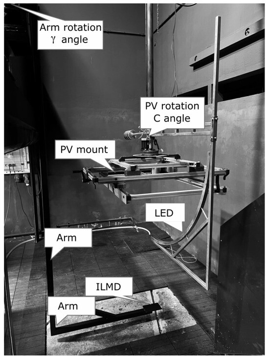 The function derived from luminance measurements is also known as the bidirectional reflectance distribution function (BRDF) [18,33,34]. Accurate measurement of the full BRDF characteristics requires the use of complex and very expensive equipment [35,36,37]. Examples of simpler devices for performing measurements in the laboratory or field can be found in [38,39]. For the purposes of this work, a measuring device was constructed from components already in the authors’ possession (Figure 2). These devices should be part of the equipment of every photometric laboratory. The laboratory setup was constructed from the following components: