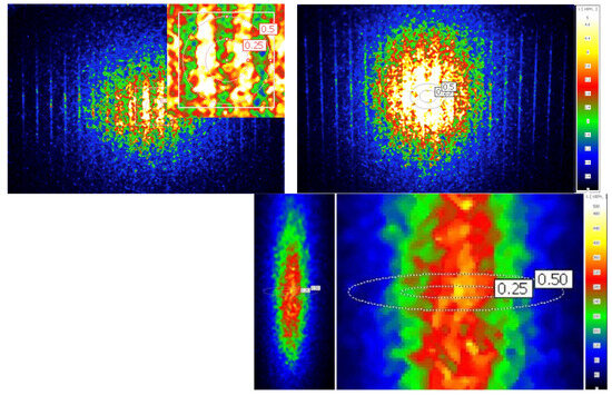 Ultimately, the results were determined for ellipses with a cone angle of 0.25 degrees. This angle is small enough to capture changes in maximum luminance and large enough that the surface roughness does not affect the result. Examples of the luminance images obtained for the PV1 panel for different viewing angles and angles of incidence (10°, 45°, and 80°) are shown in Figure 4.