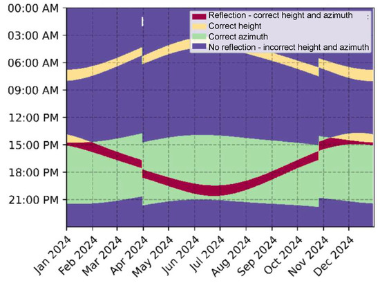 - Blue—there will be no reflection of the sun towards the observer due to the inappropriate position of the PV panel in terms of height (vertical axis Z) and azimuth (rotation around the vertical axis Z);