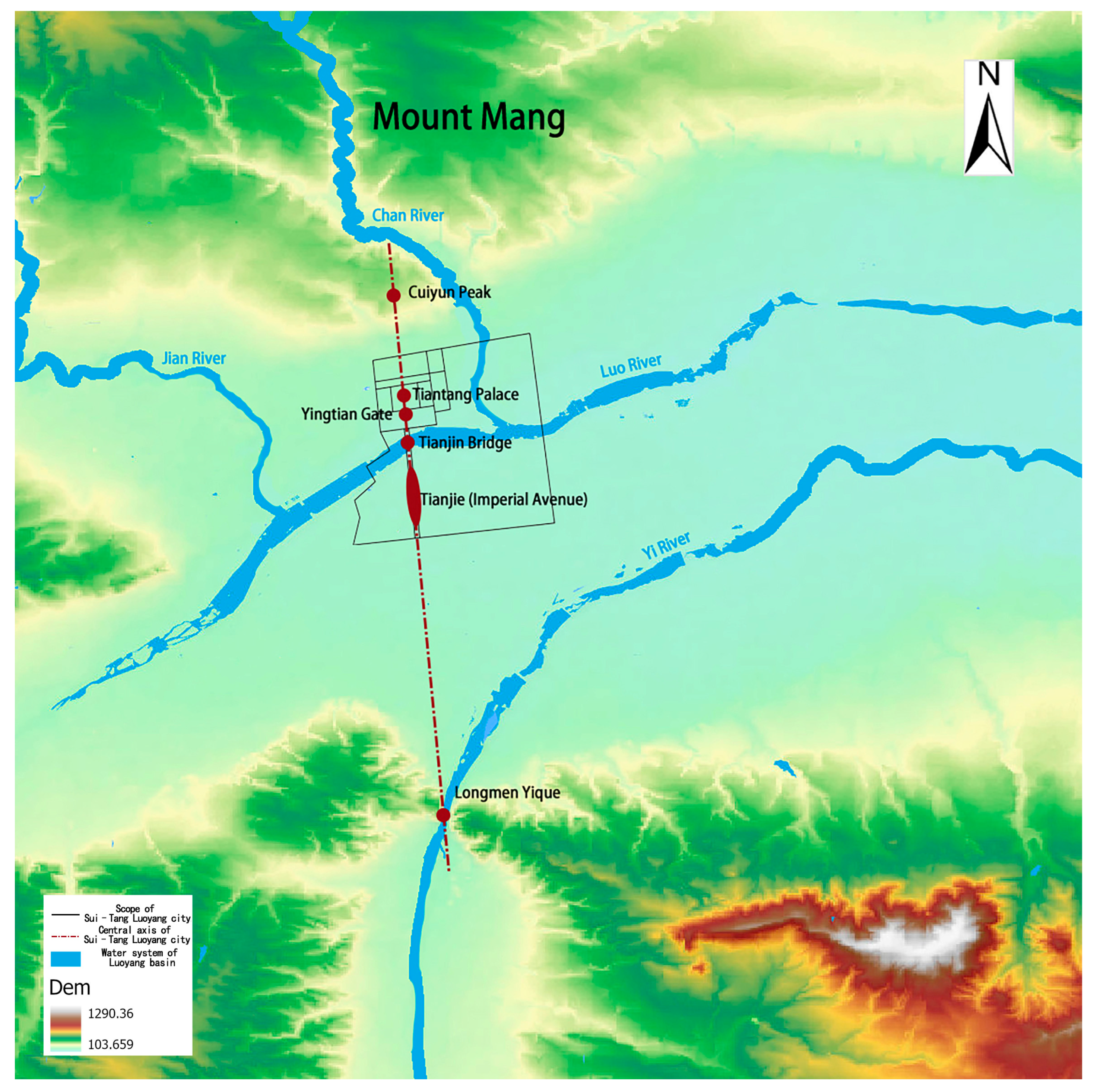 - Niu, Y.; Dong, W. Deriving the construction principles of landscape cities through historical information translation: A case study of Sui–Tang Luoyang city. In New Normal: Inheritance and Change—Proceedings of the 2015 China Annual National Planning Conference, Guiyang, China, 19–21 September 2015; Volume 03: History and theory of urban planning; China Association of City Planning: Beijing, China, 2015; pp. 274–283. [Google Scholar]