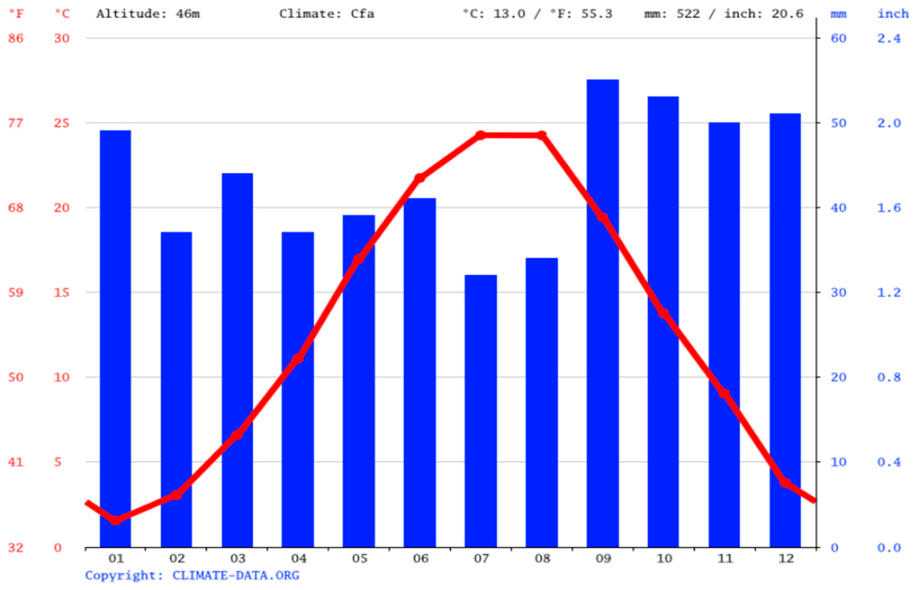 10]. The average annual temperature is around 13 °C, with mild winters (average daily temperature between 1–2 °C in January) and warm summers, with average highs of 23–23.5 °C in July–August (