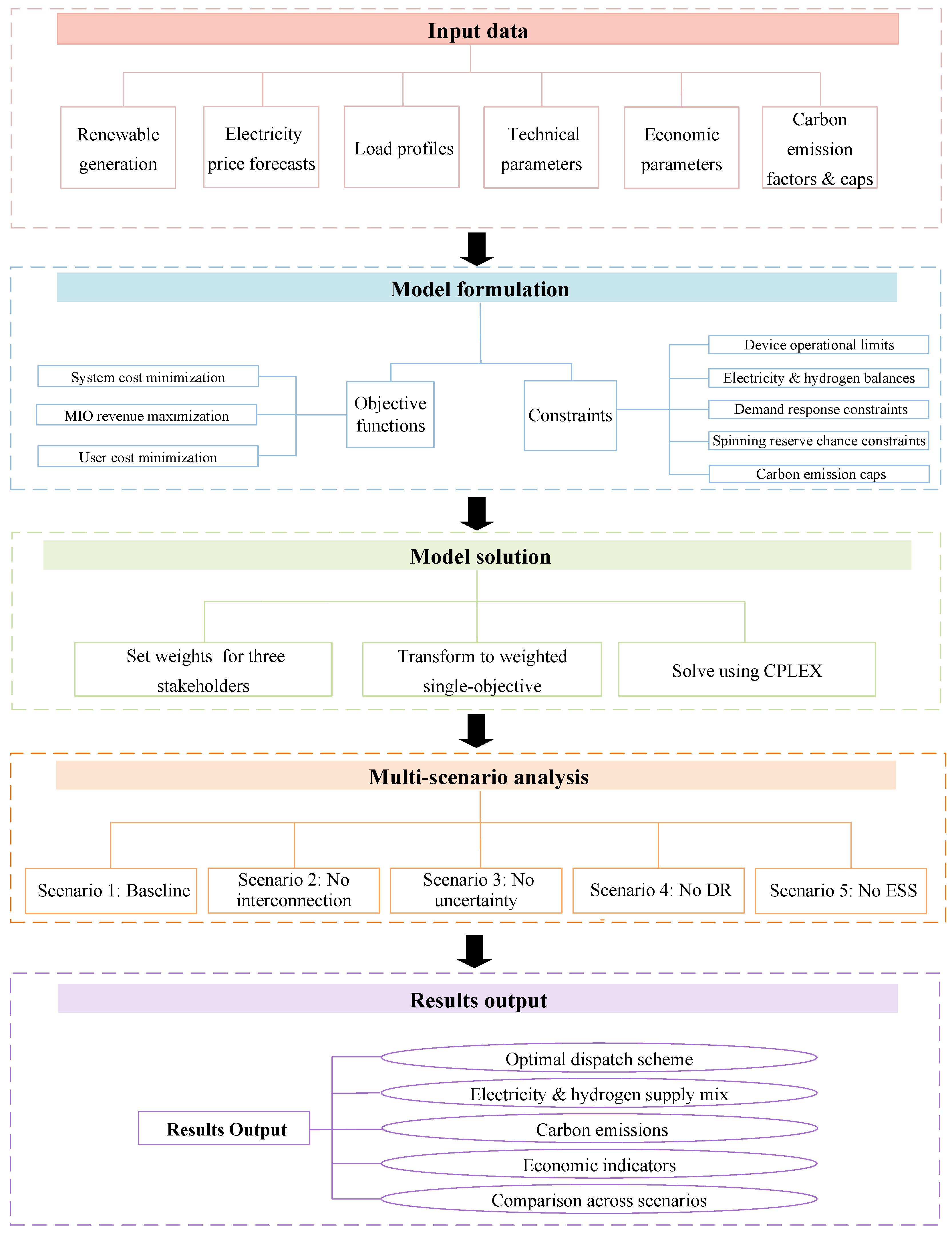 - Develops a multi-objective scheduling optimization model based on electricity price forecasting to balance the interests of multiple stakeholders, including the system itself, external energy suppliers, and end-user. The model simultaneously considers carbon emission constraints, electricity and hydrogen balance constraints, and various forms of incentive-based DR for electricity and hydrogen loads.