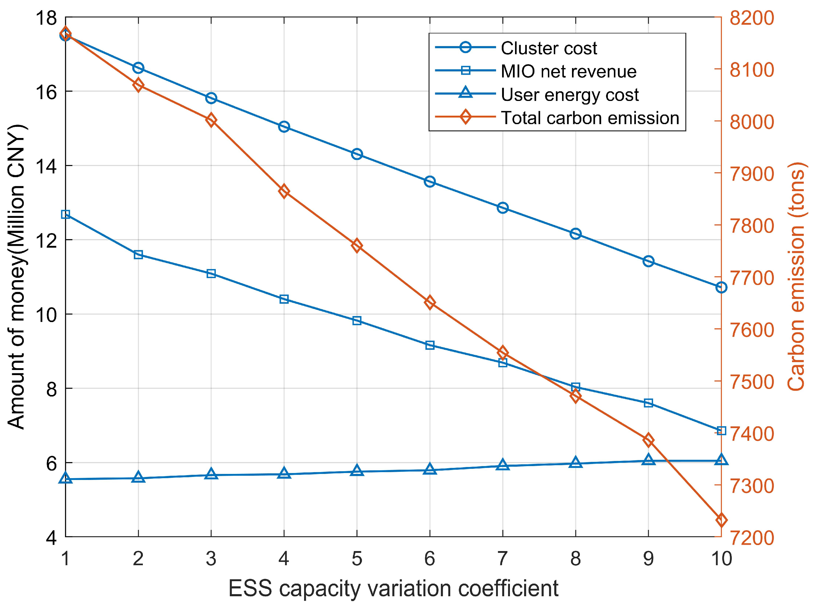 - As the ESS capacity coefficient increases from 1 to 10, the cluster cost decreases by 38.8% and carbon emissions fall by 11.5%. In contrast, the user energy cost rises by 8.9%, and MIO’s net revenue is reduced. Overall, expanding capacity enhances system-wide economic and environmental performance.