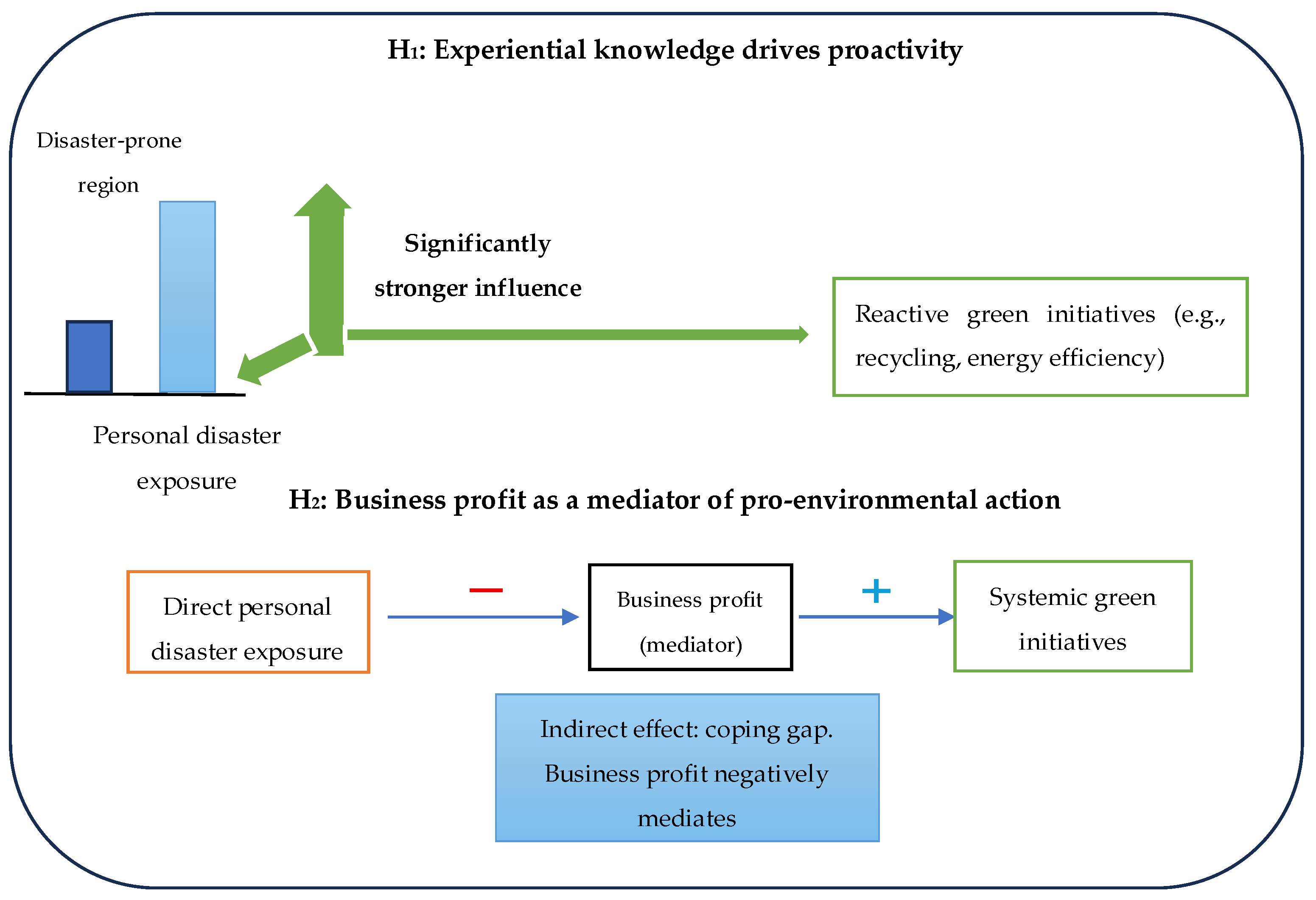 H2: Direct personal exposure to natural disasters positively influences the adoption of reactive environmental initiatives, but this relationship is negatively mediated by business profit for systemic mitigation measures, such as emission reductions and structural efficiency.