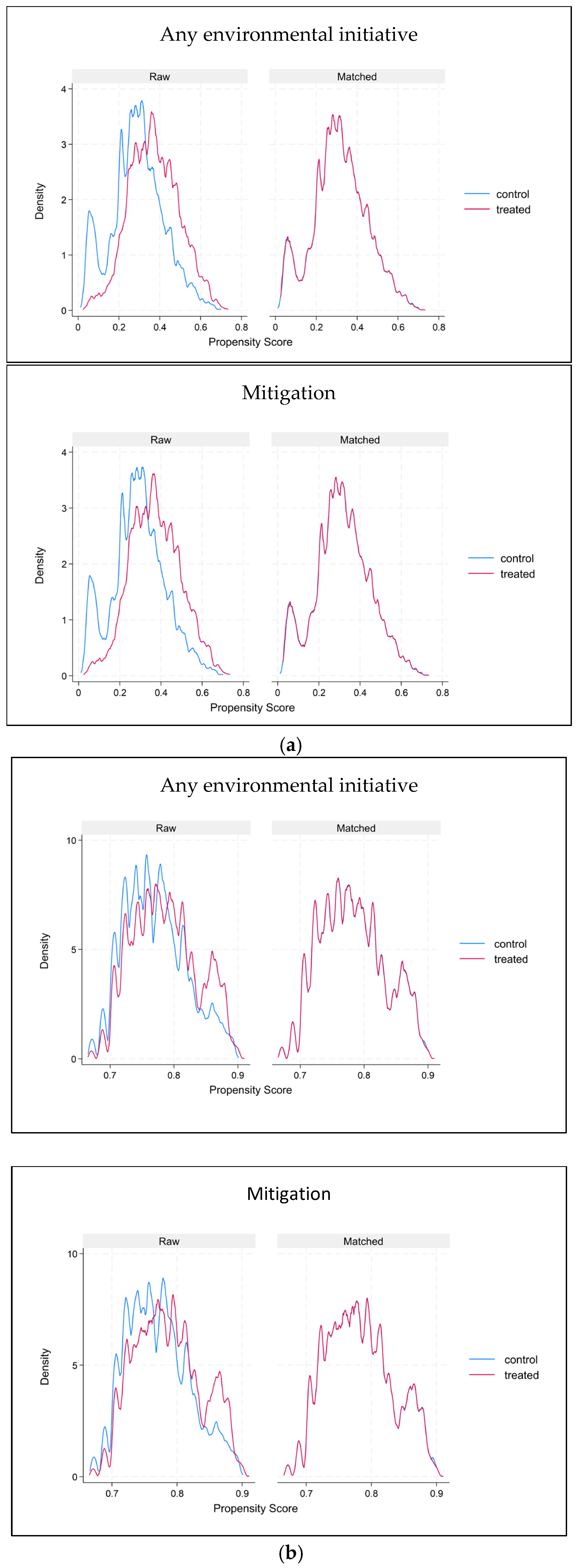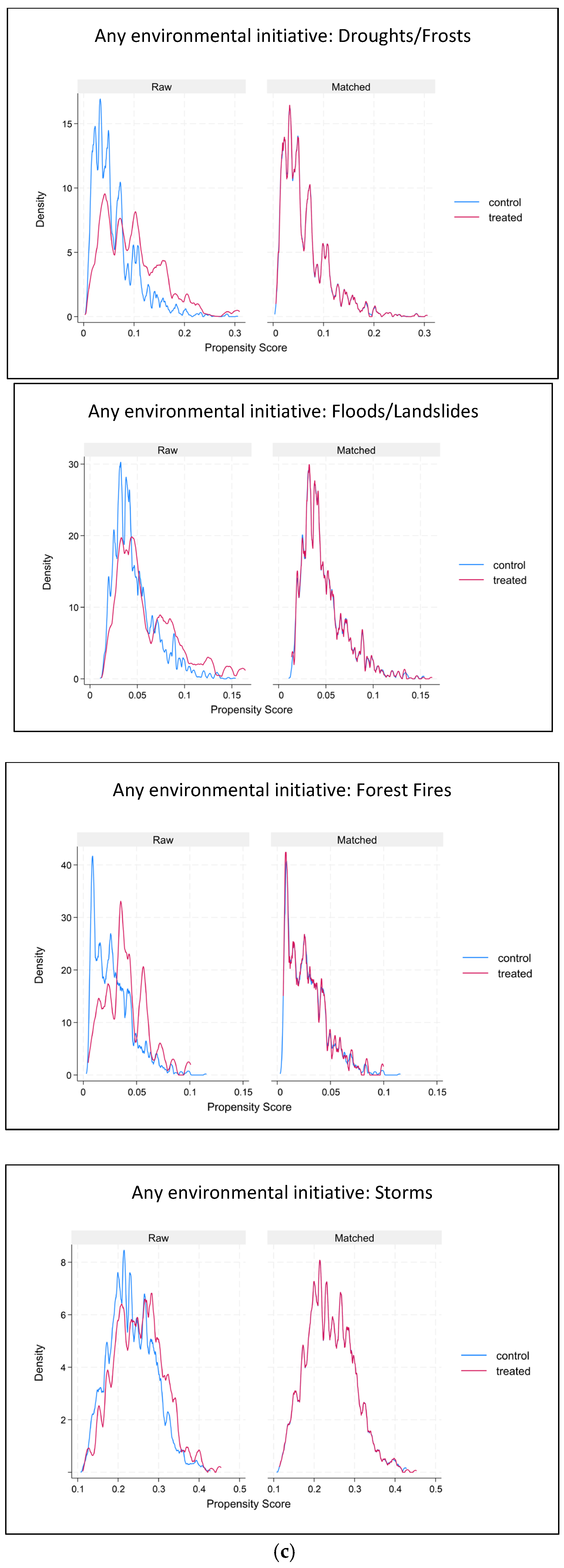 Figure 3 displays kernel density plots to evaluate the balance of the estimated propensity scores between the treatment and control groups. Panels (a) and (b) illustrate the balancing for Any environmental initiative and Mitigation, respectively; these are presented separately to account for the slight variations in sample size (1,780,799 versus 1,778,840). The density plots for Energy/Emissions, Efficiency, and Recycling are omitted for brevity, as they are analogous to that of Any environmental initiative due to their identical treatment and estimation samples. Panel (c) in turn presents similar plots for any environmental initiative under the different treatments of droughts/frosts, floods/landslides, forest fires, and storms. Across all specifications, the figures demonstrate that common support is achieved, with the treated and control distributions aligning closely after matching. It is worth noting that the propensity score range reflects the baseline probability of treatment. For instance, the estimated likelihood of experiencing a storm for the matched units in Panel (c) is concentrated between approximately 10% and 45%.