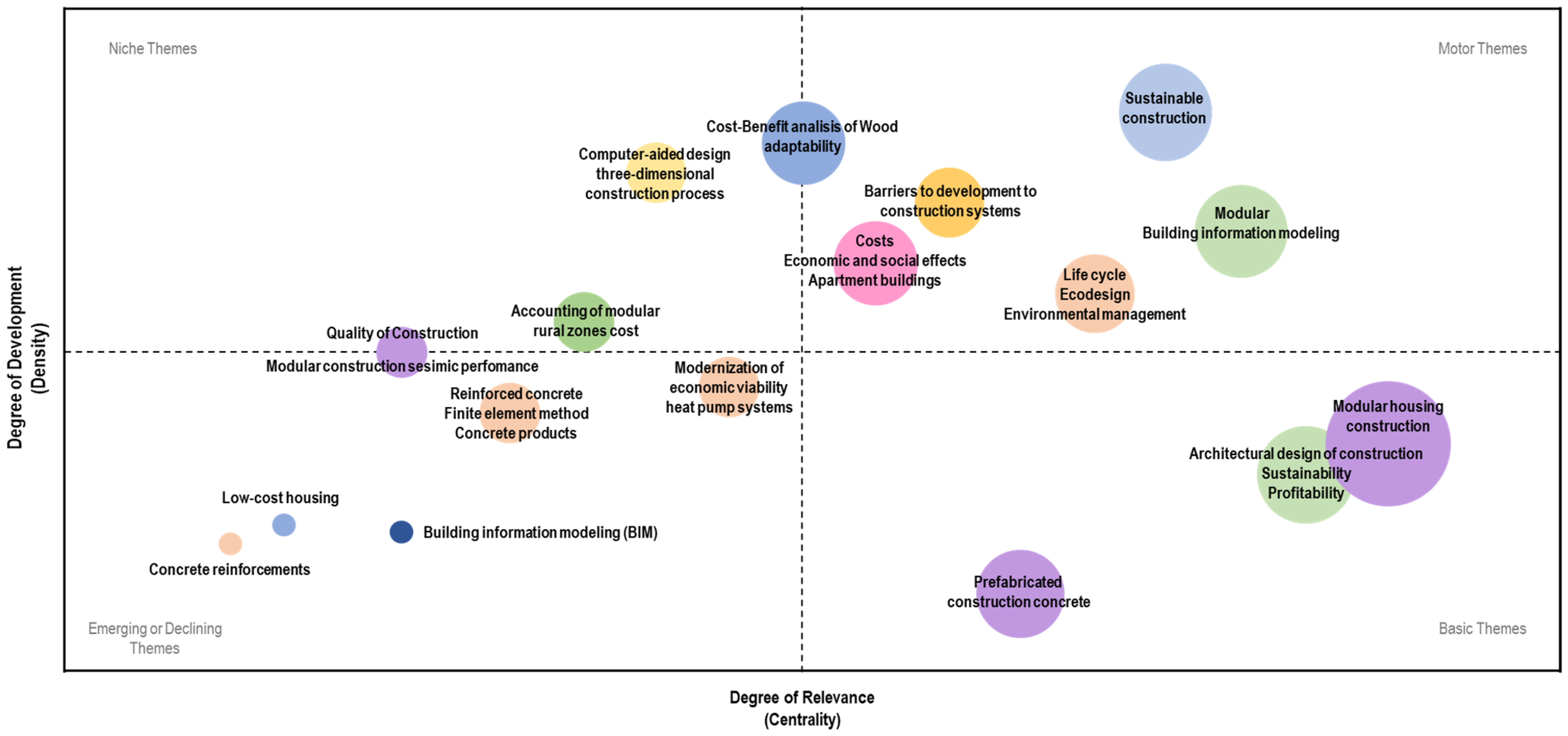- Emerging or declining themes (lower-left quadrant) encompass topics such as construction quality, reinforced concrete systems, low-cost housing, and structural analysis approaches (e.g., finite element methods). Their lower levels of centrality and density suggest either emerging research directions or areas undergoing conceptual transition, reflecting ongoing concerns related to affordability, durability, and technical performance of prefabricated systems [57,58,59].