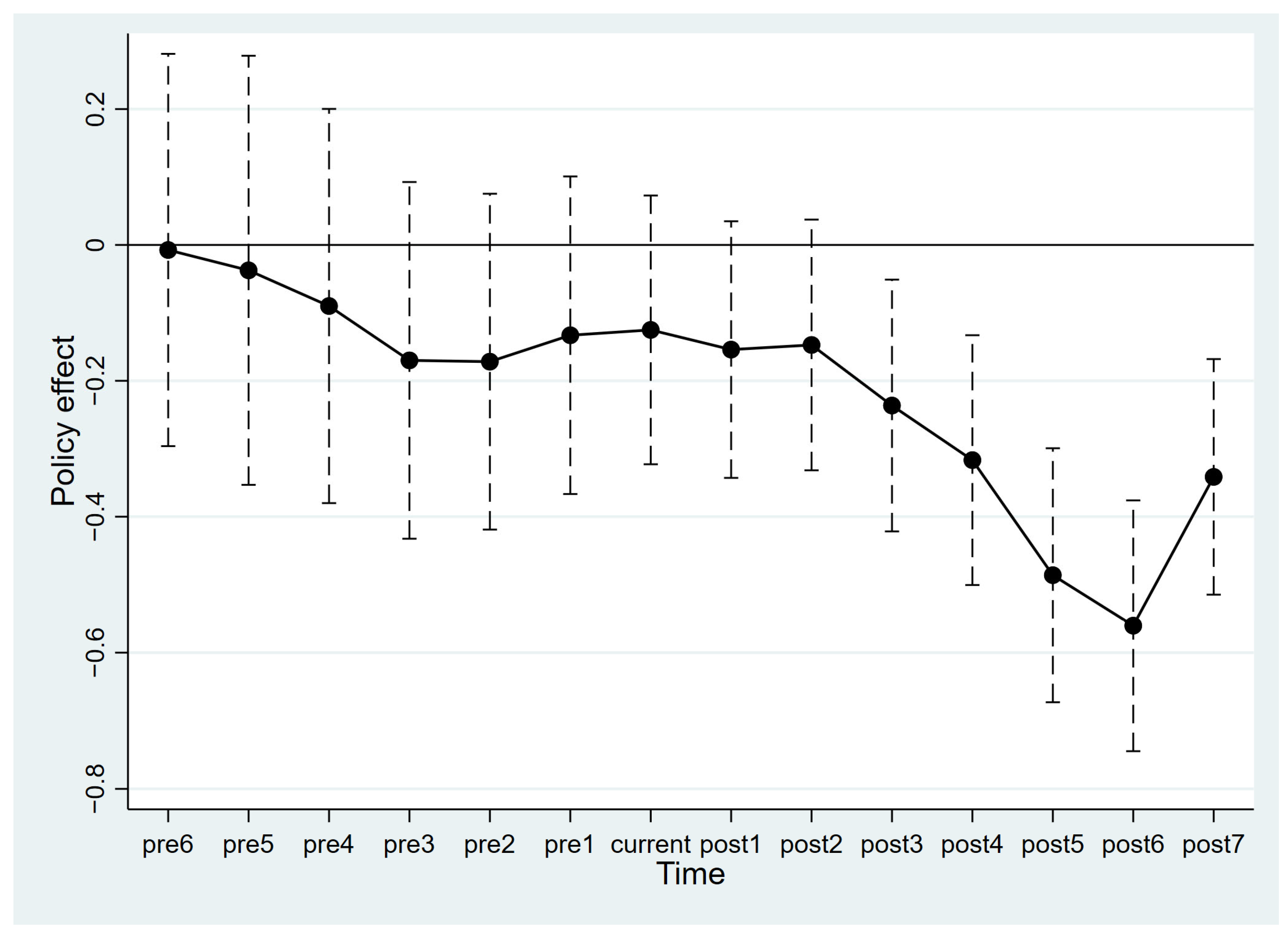 To verify the parallel trend assumption of the multi-period DID model, this study constructs a dynamic effect model based on Equation (2), and selects observations from 7 years before to 7 years after the establishment of AAC for an event-study analysis. We focus on examining whether the green innovation trends of the treatment and control groups are parallel prior to the establishment of AAC, so as to judge whether the baseline regression results satisfy the core identification assumption of the DID model.