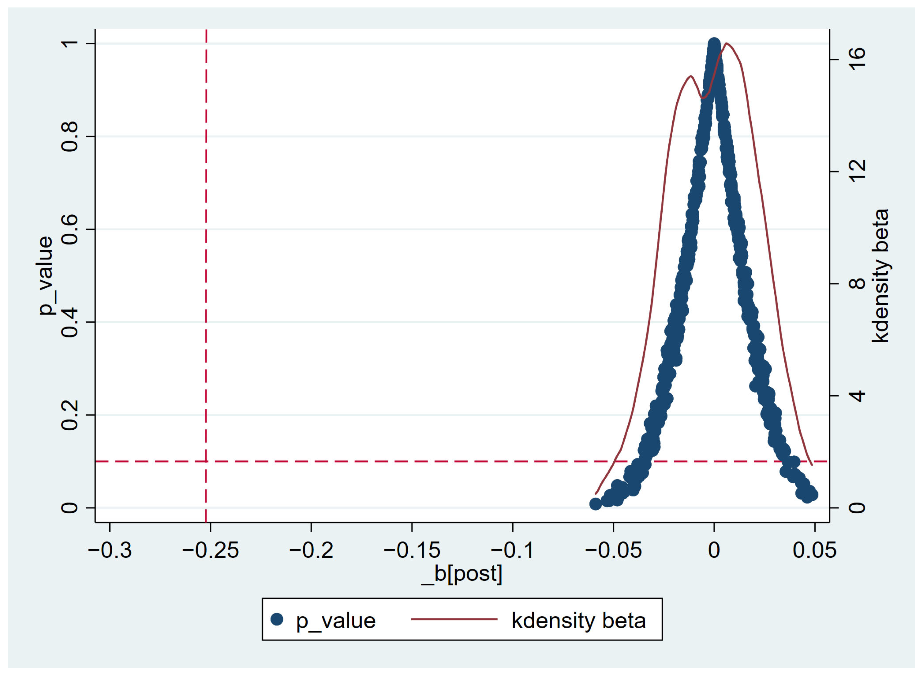 37]. For each iteration, we estimate the placebo treatment effect and compare its distribution with our baseline estimate. This approach allows us to examine whether the observed policy effect could arise by chance. If the placebo estimates differ significantly from the true policy effect, it suggests that our findings are unlikely to be driven by random noise or omitted variables.
