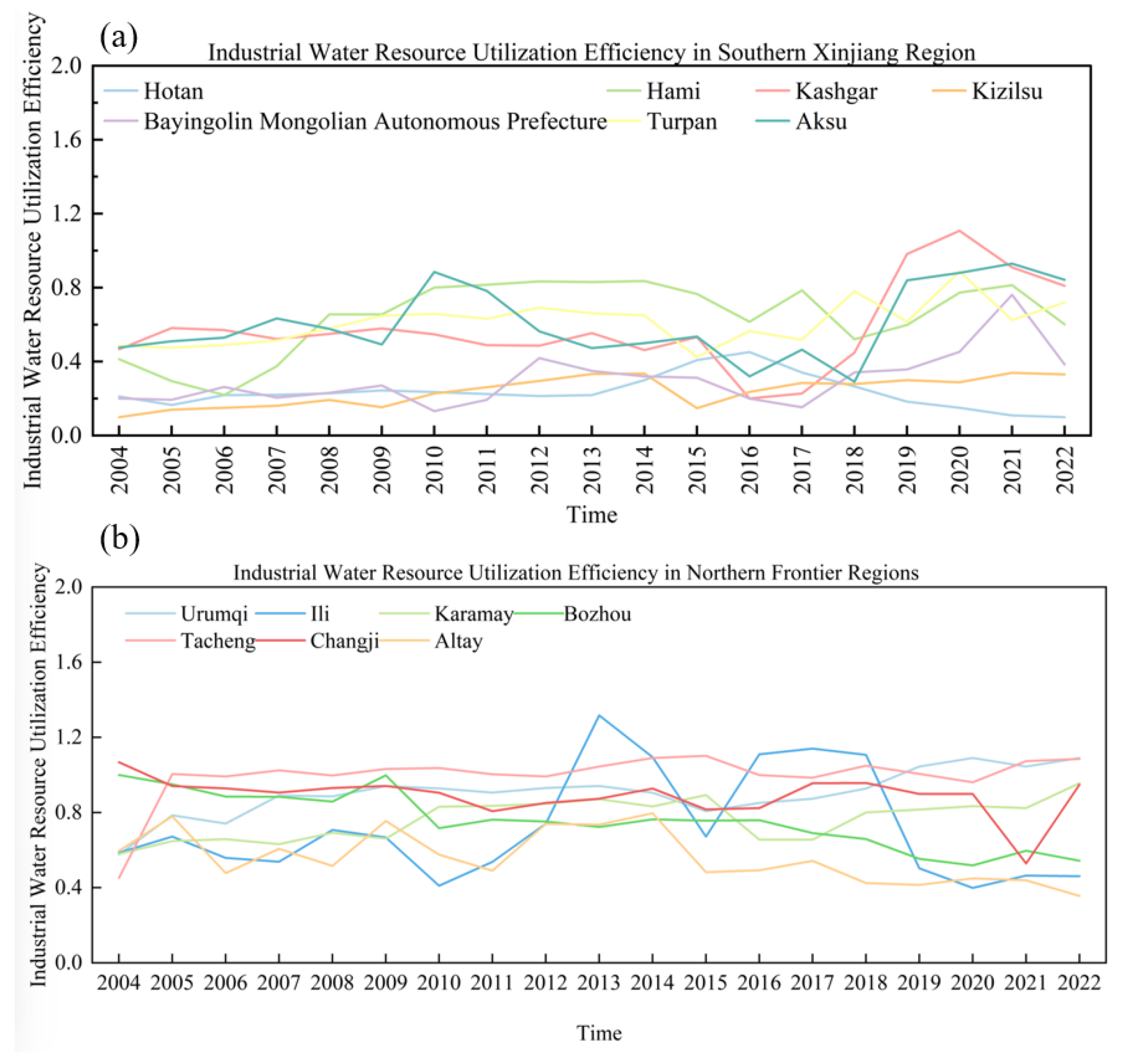 - Analysis of the urbanization rate threshold effect: As a typical representative of China’s arid northwest, Xinjiang has experienced leapfrog urbanization and industrialization over the past two decades. The urbanization threshold identified in this study (0.2301) is relatively low, mainly due to the unique starting point of oasis city development in arid regions and the imbalance between early industrialization and urbanization. This low threshold clearly captures the sensitivity of IWRUE to the early stages of urbanization in arid regions.