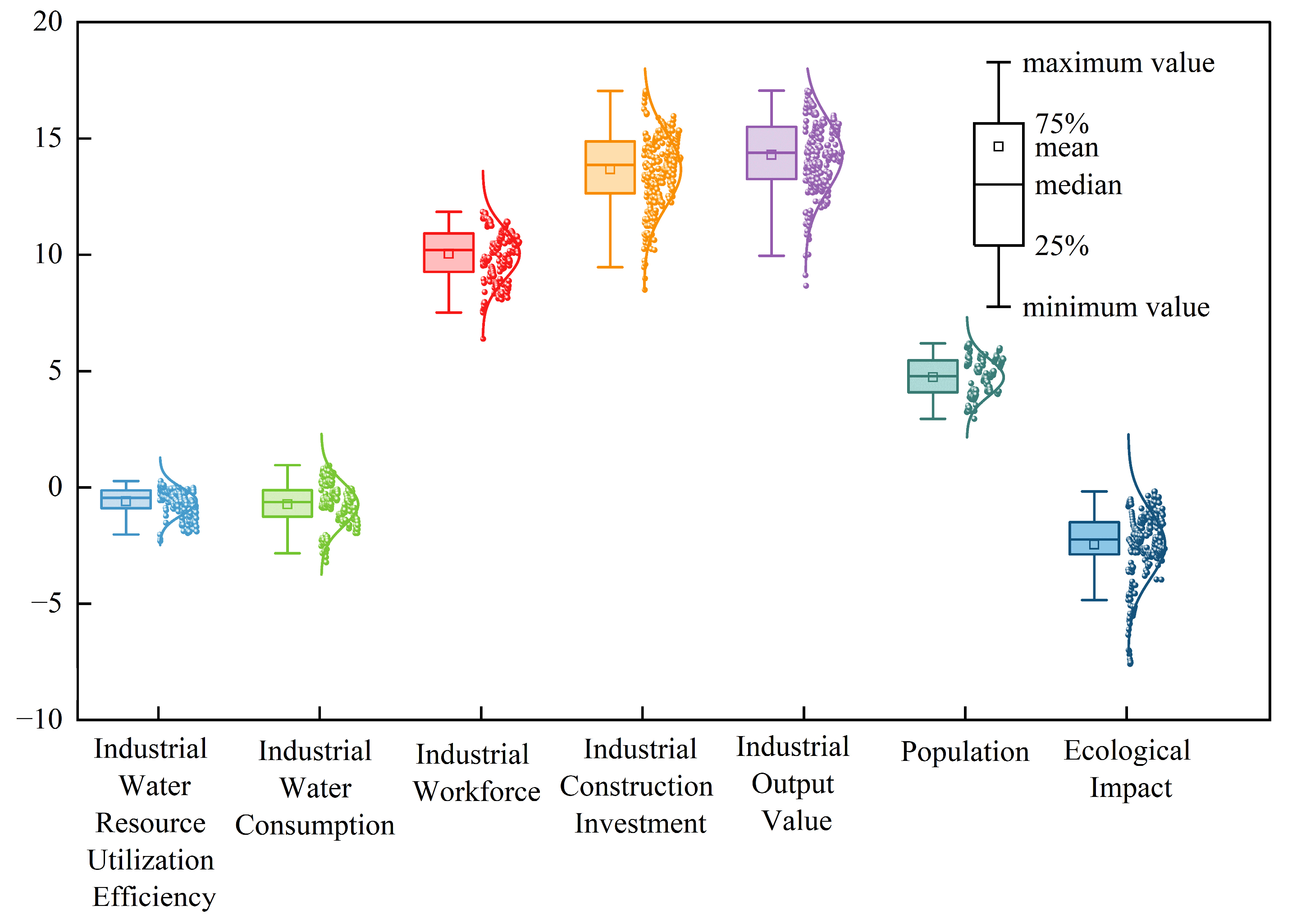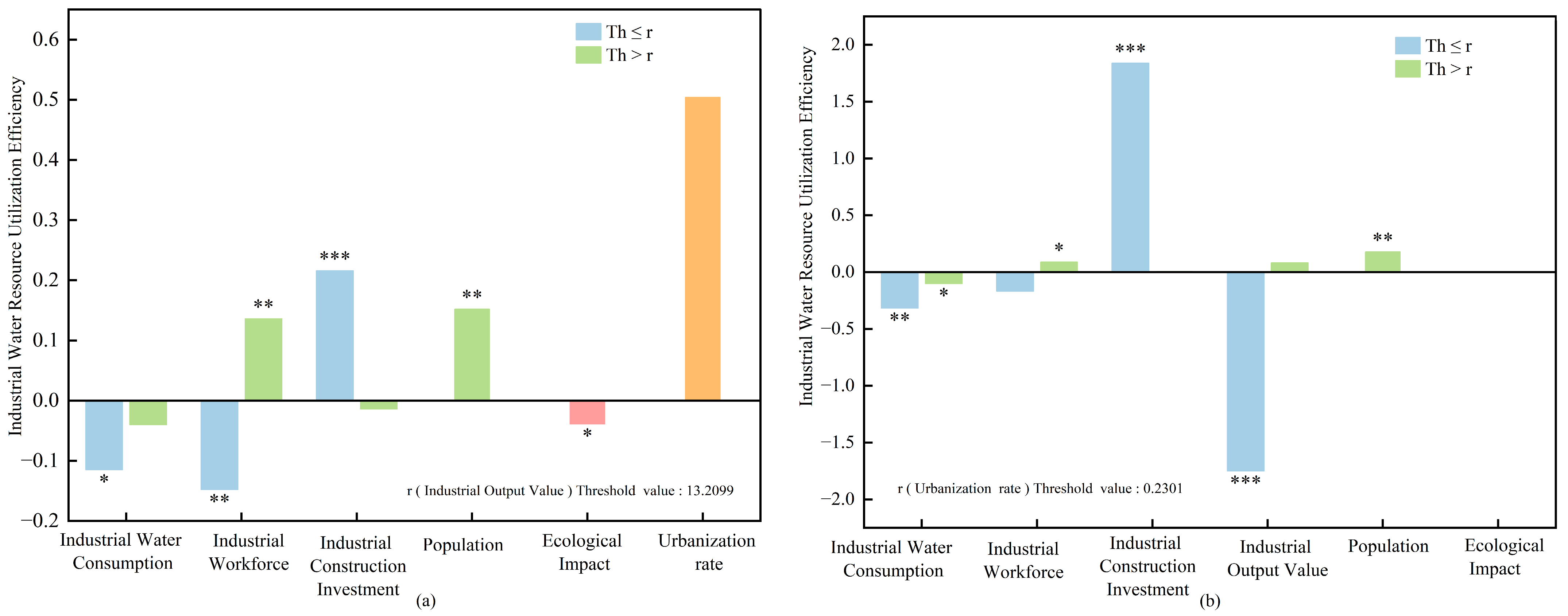 - Analysis of the industrial output threshold effect: When industrial output is below 13.234, the elasticities of industrial water consumption and industrial employment are negative (−0.110 and −0.134, respectively). This reflects that, in the early stage of industrialization, economic growth is characterized by extensive development [27], in which output expansion is primarily driven by large-scale accumulation of resource inputs [28]. During this period, the absence of economies of scale and advanced management means with increased output are often offset by rapid growth in resource consumption, thereby reducing IWRUE [29,30]. However, once this threshold is crossed, a qualitative shift occurs. The inhibitory effect of water consumption weakens significantly and loses statistical significance, while the effect of employment changes from negative to positive (r = 0.145). This indicates that, with industrial expansion, the “human capital dividend” and “technology spillover effect” begin to emerge. High-quality labor enhances IWRUE by optimizing production processes and applying water-saving technologies. As the industrial scale expands, the emergence of human capital dividends and technological spillovers becomes a key driver of IWRUE improvement [31,32]. High-quality labor facilitates process optimization and the rapid adoption of water-saving technologies, enabling enterprises to shift from extensive resource consumption toward intensive management [33,34].