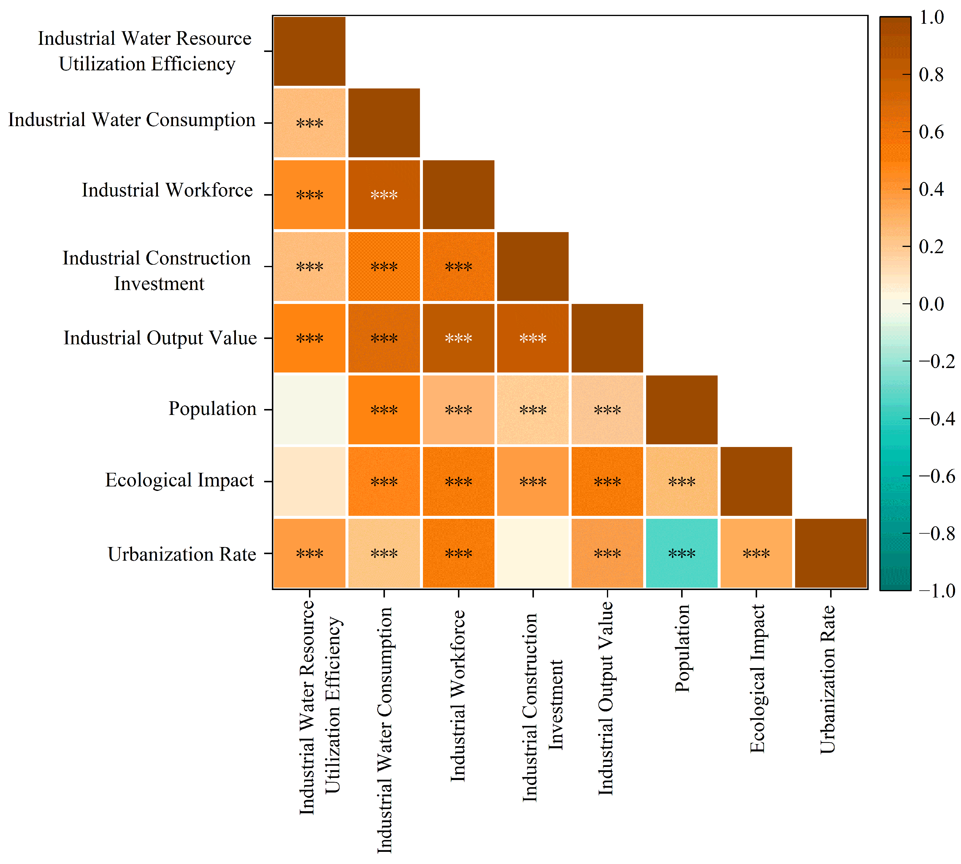- Multicollinearity test: Variance inflation factor (VIF) testing (Table 4) shows that, except for industrial employment and industrial output value, the average VIF values of all variables are below 5, thereby excluding serious multicollinearity concerns.