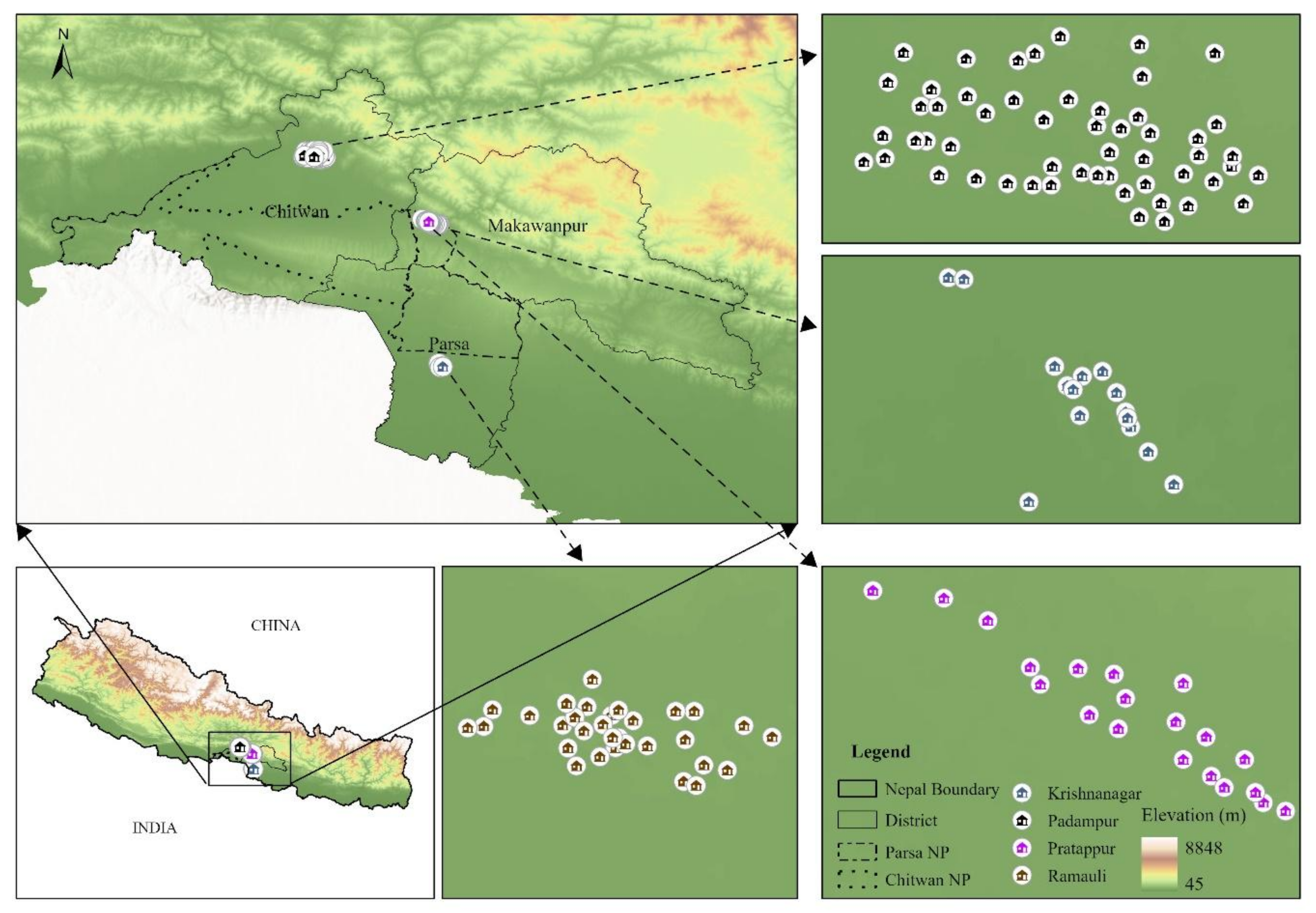 - Pandey, H.P.; Maraseni, T.N.; Apan, A. Resettlement for Conservation: Assessing Health and Social Security Challenges in Nepal’s Biodiverse Regions. Glob. Transit. 2025, 7, 247–261. [Google Scholar] [CrossRef]