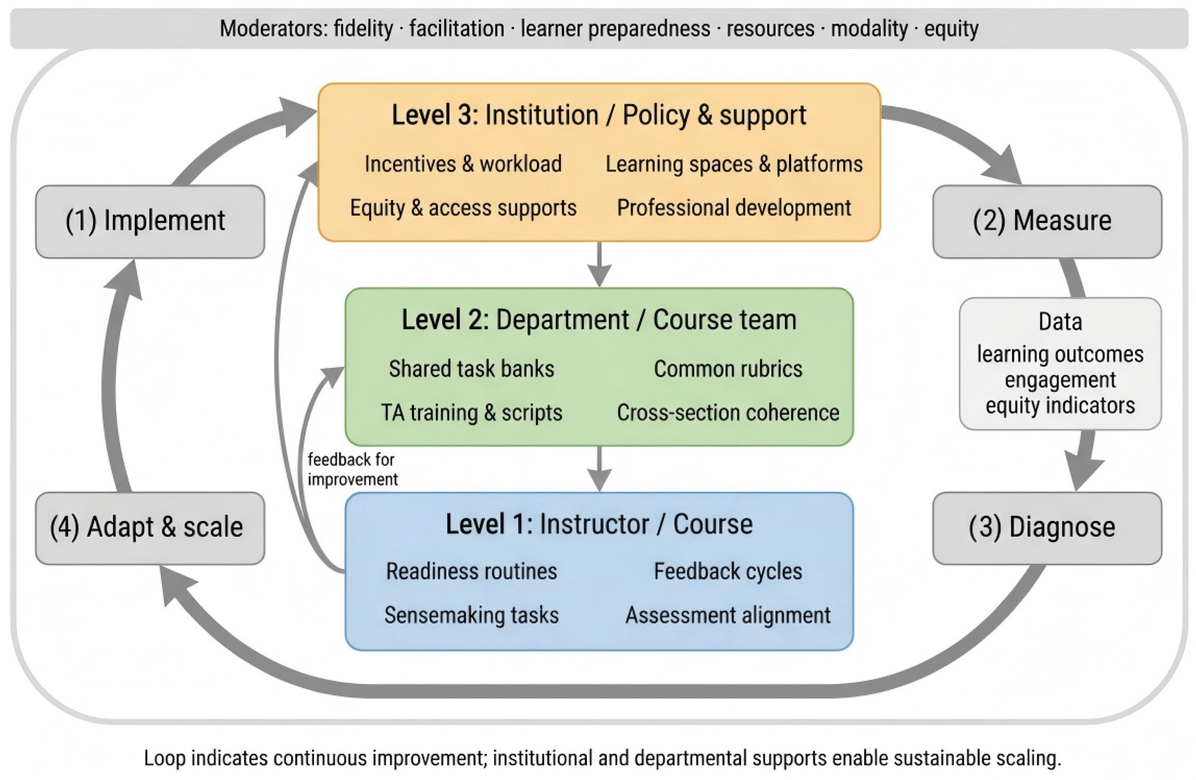 | Implementation quality | Teacher fidelity (principle fidelity vs. scripting) | Fidelity predicts outcomes when defined as preserving explanation–feedback–revision mechanisms, not strict scripts | Over-scripting suppresses autonomy/exploration; under-fidelity leads to pseudo-active tasks | Observe enactment; coach facilitation moves; permit adaptive responsiveness while preserving mechanisms | [33] |