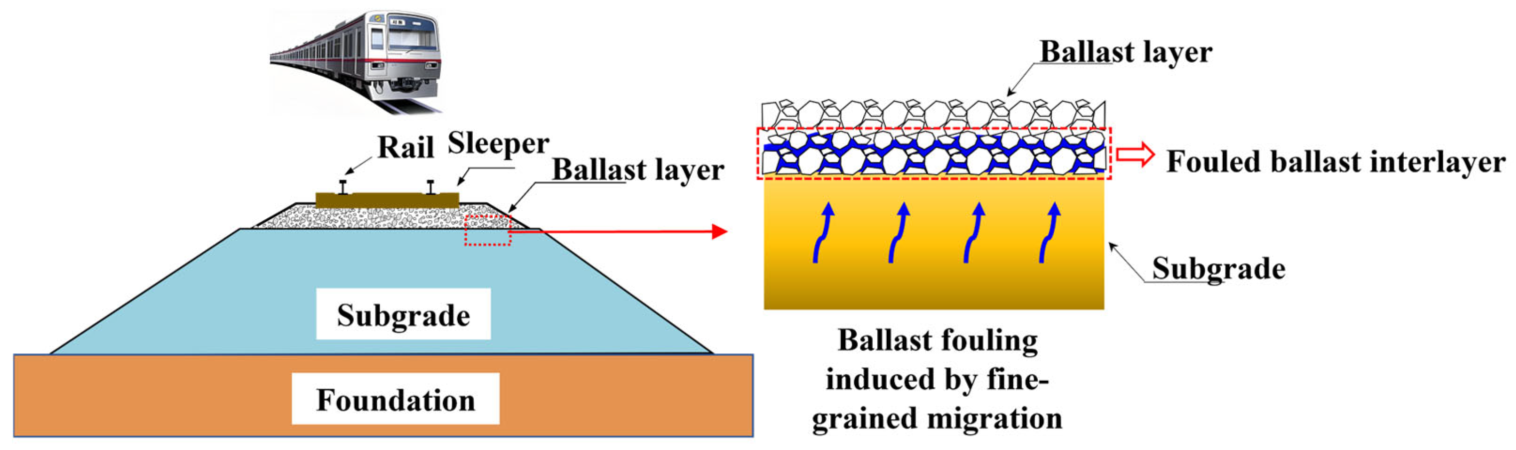 - Han, B.W.; Cai, G.Q.; Li, J. Investigating particles migration caused by mud pumping in ballasted track subgrade under cyclic loading–wetting coupling. Transp. Geotech. 2022, 37, 100830. [Google Scholar] [CrossRef]