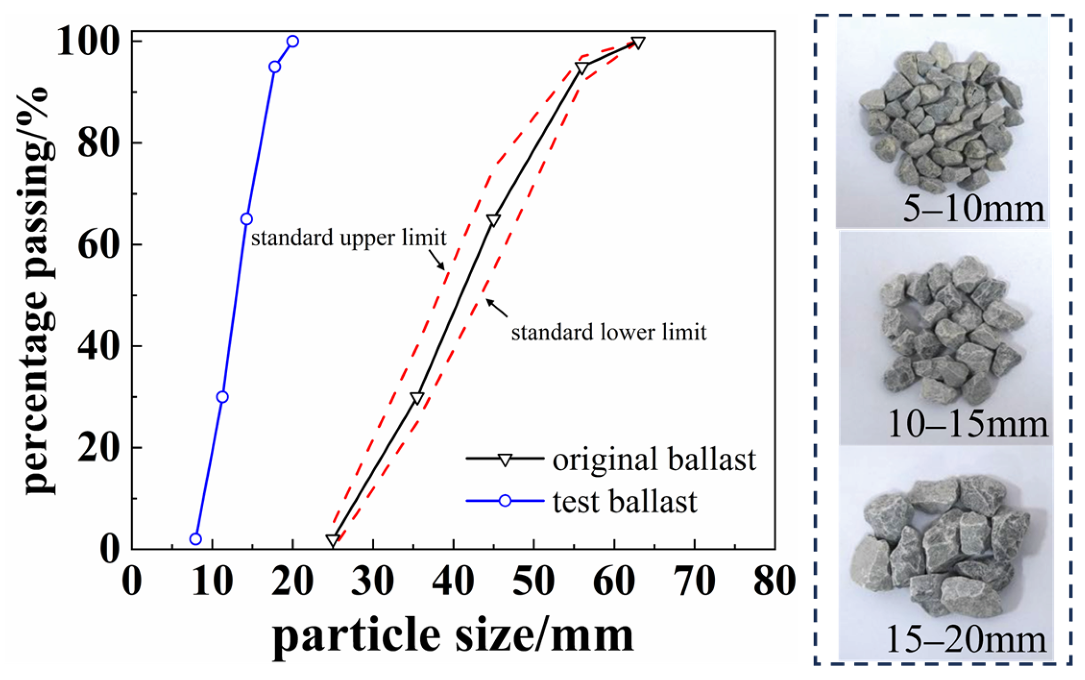 - Zhang, D.; Cui, K.; Li, Q. Experimental investigation of the accumulated axial strain of mud-fouled ballast under long-term cyclic loading. Transp. Geotech. 2025, 57, 101842. [Google Scholar] [CrossRef]