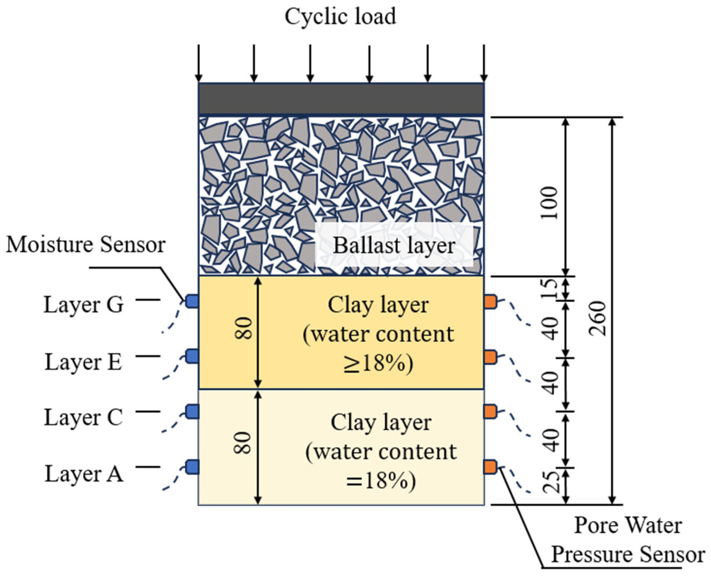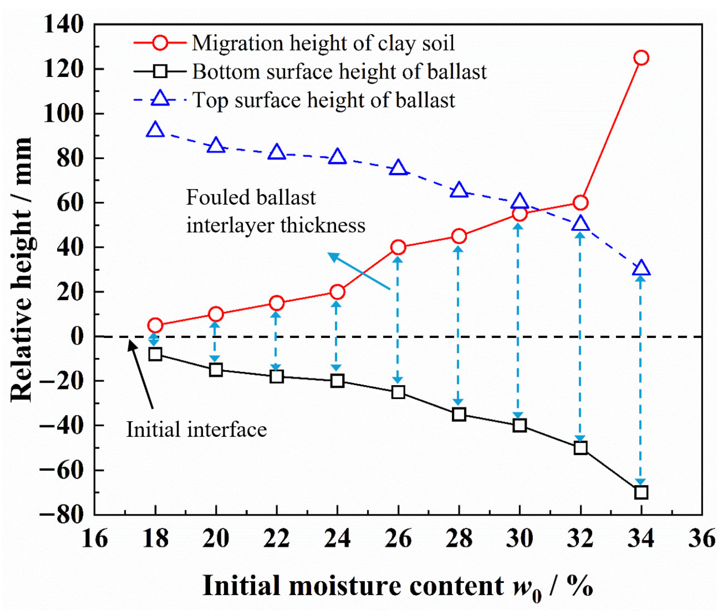 - Ballast penetration combines with the upward migration of fine particles to form a fouling ballast interlayer under cyclic loading. As the initial moisture content of the overlying fine-grained soil increases, the interlayer thickens gradually. Once the initial moisture content exceeds the liquid limit, the interlayer thickness increases markedly. At moisture contents above 30%, fine particles migrate further upward to the top of ballast, resulting in mud pumping. Overall, the evolution of the fouling interlayer follows a synergistic mechanism governed by ballast penetration, upward moisture movement, and fine particle accumulation.
