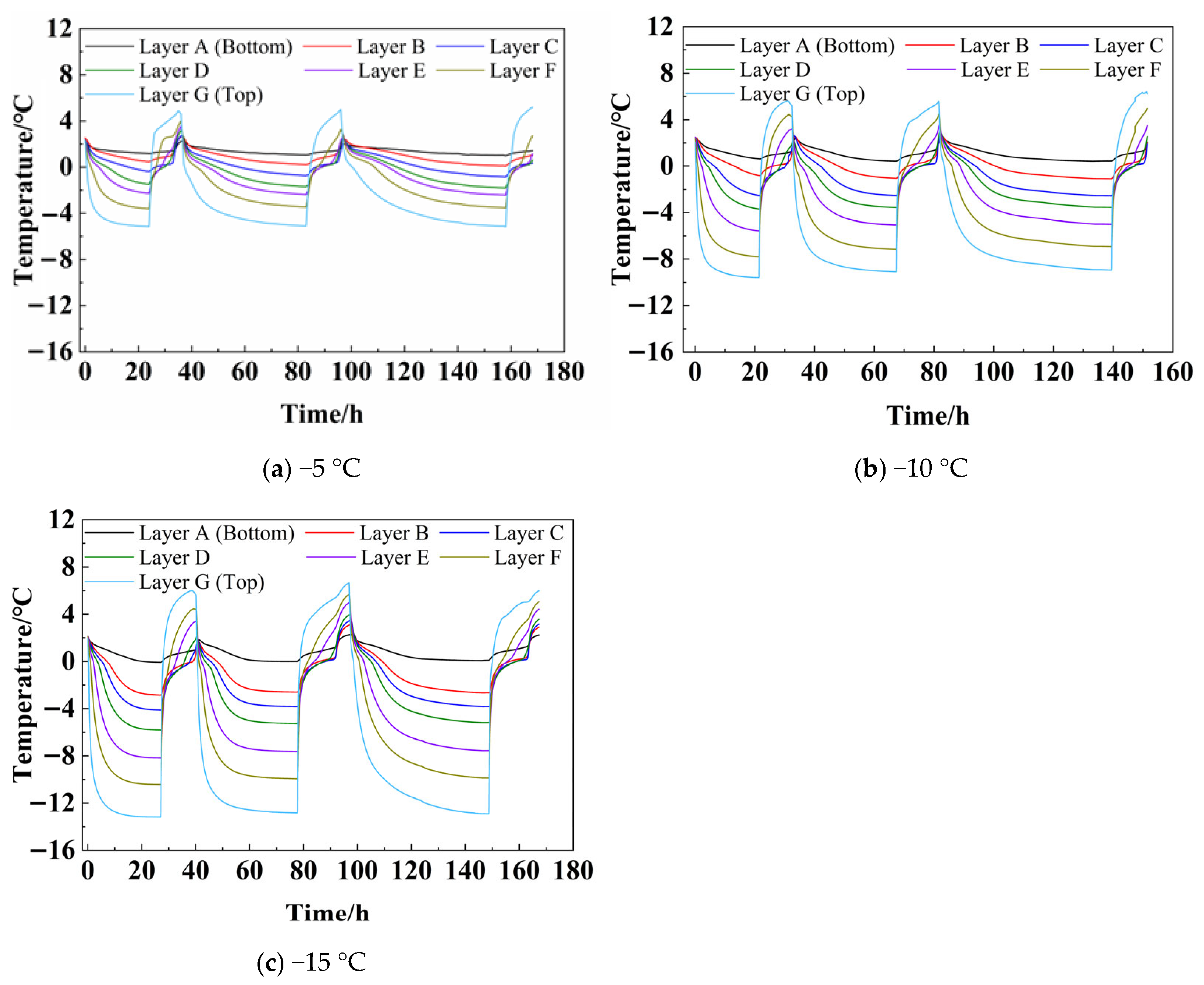 | Test No. | Top Freezing Temperature (°C) | Top Melting Temperature (°C) | Environment Temperature (°C) | Bottom Temperature (°C) | Freeze–Thaw Cycles |