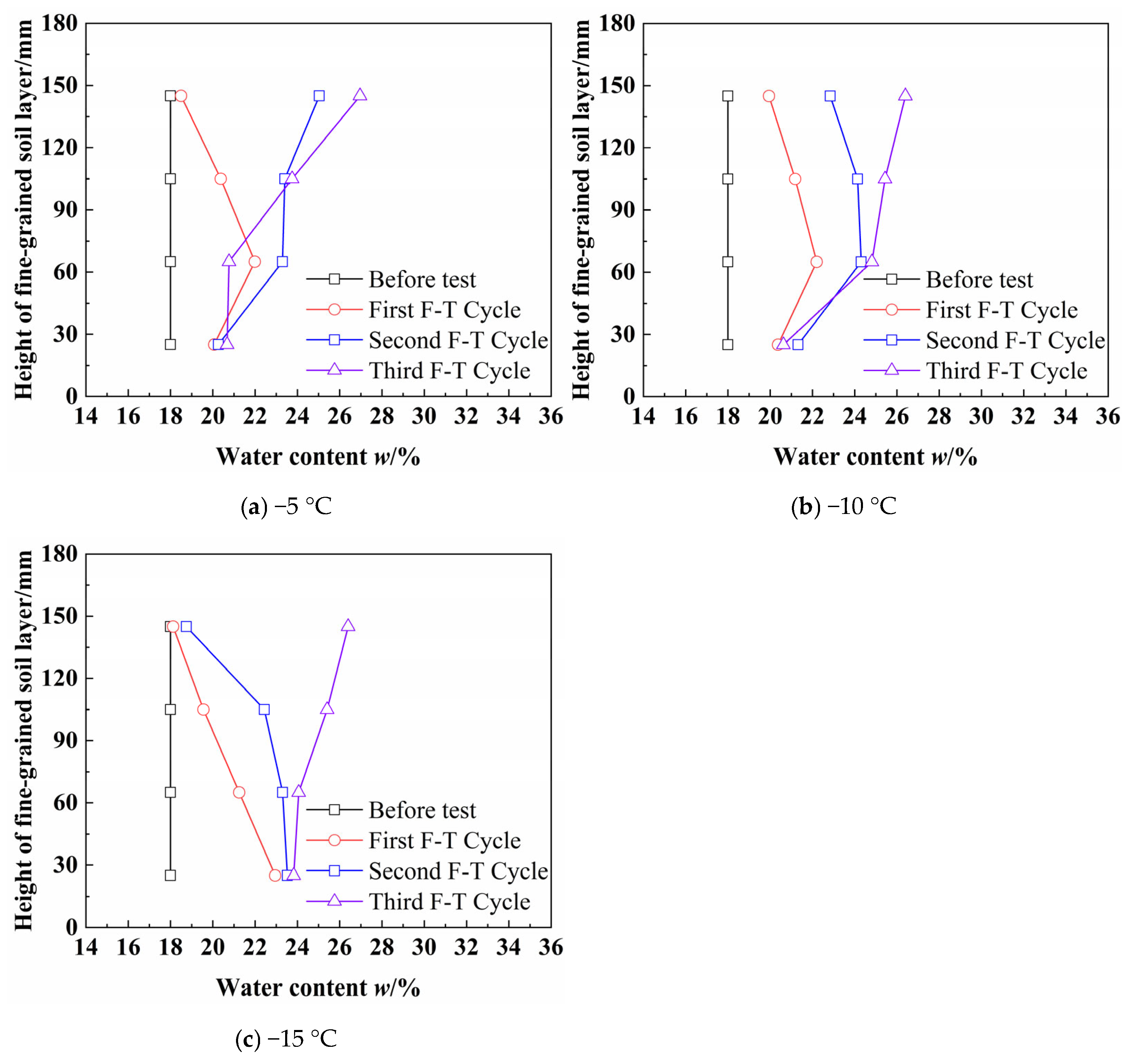 - The temperature variation along the height of the fine-grained soil specimen showed pronounced nonlinear characteristics during freeze–thaw cycles. The shallow soil cooling rapidly than deeper soil. Under open water supply during freezing, the temperature gradient drove unfrozen water migration toward the freezing front, forming ice lenses. During thawing, meltwater was hindered by the low permeability of the underlying frozen layer and accumulated in the upper soil. As freeze–thaw cycles increased, the water content in the top layer increased significantly, eventually forming a clay layer with high water content.