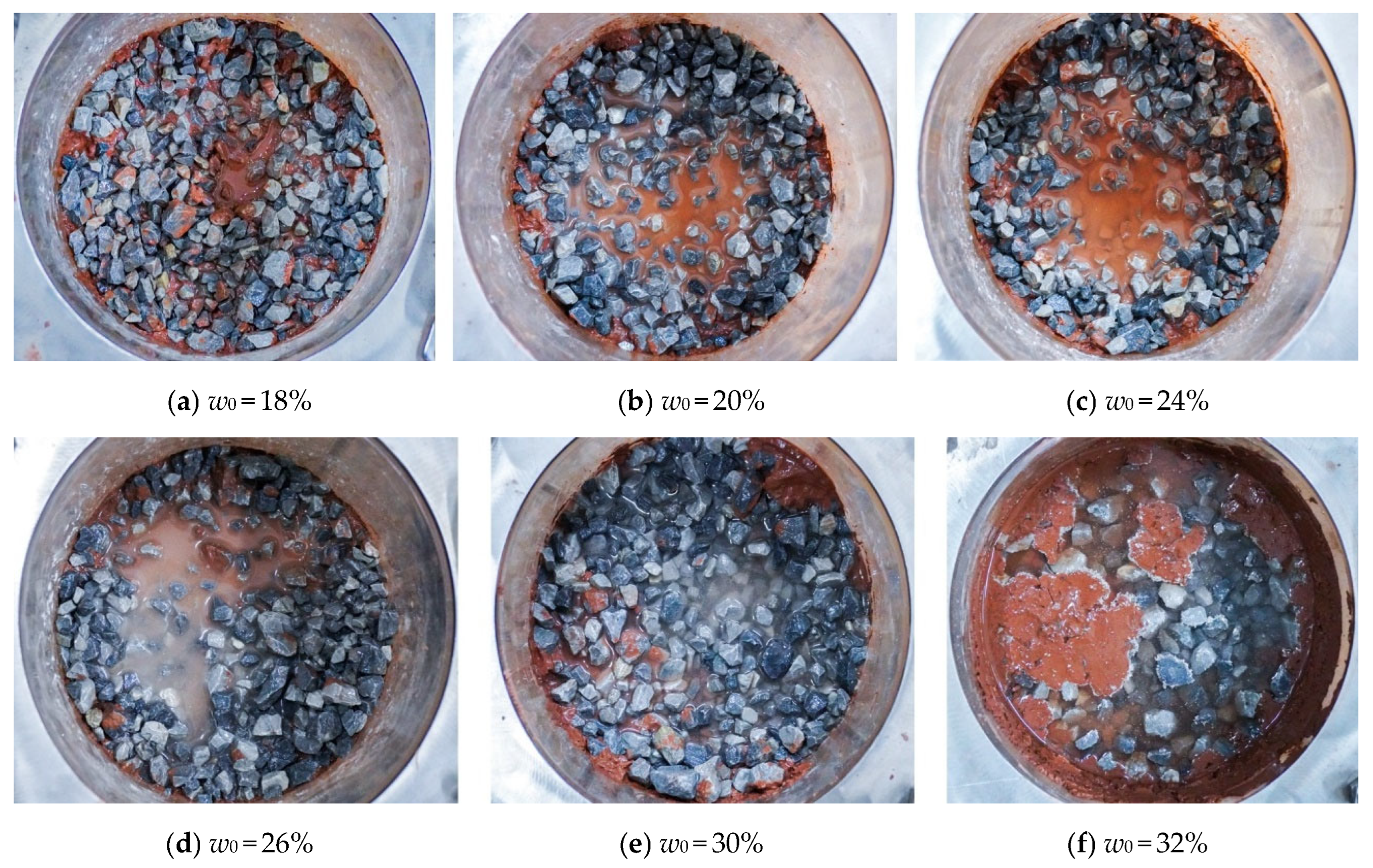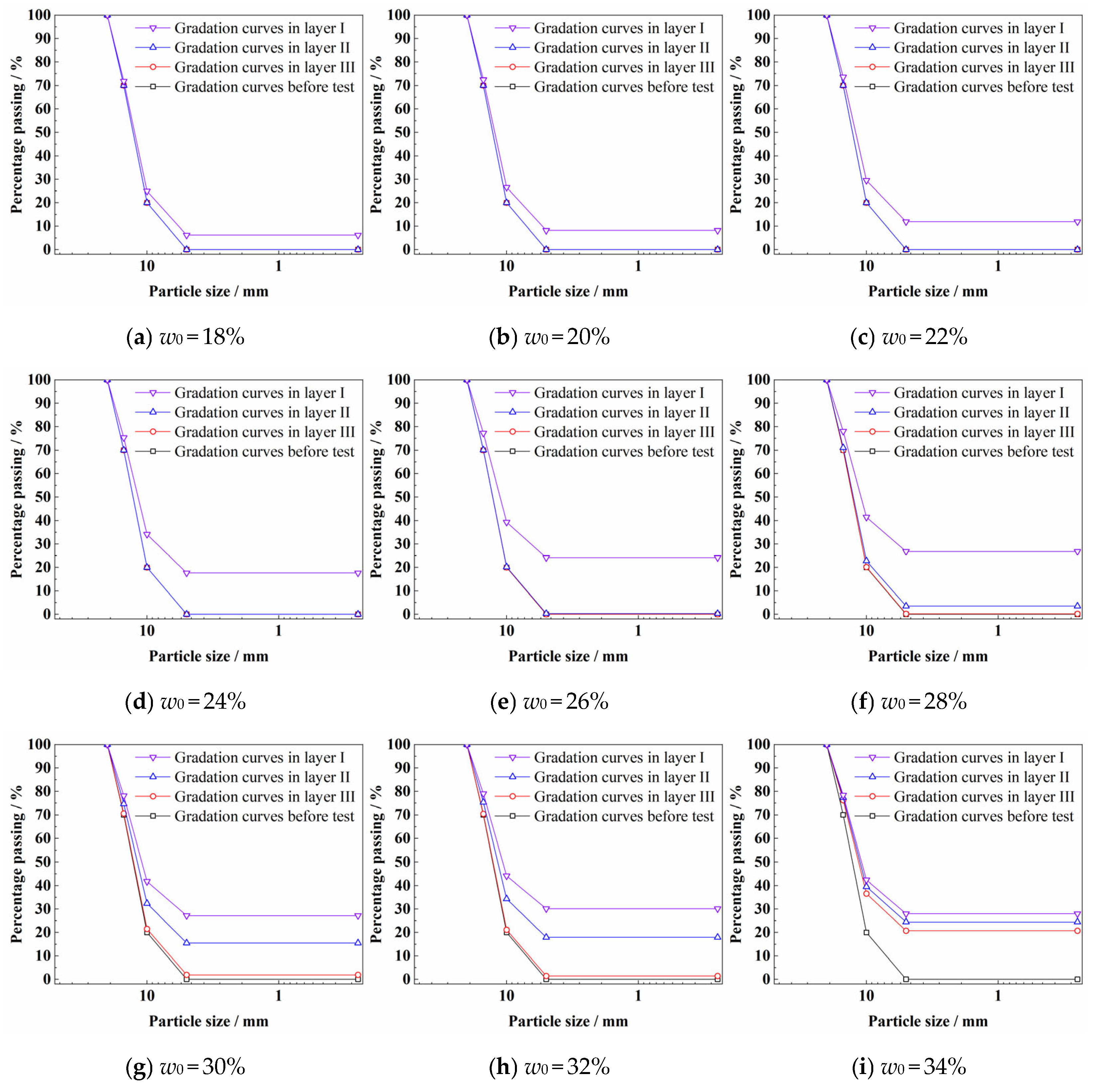 - Ding, Y.; Jia, Y.; Wang, X.; Zhang, J.S.; Chen, X.B.; Luo, H.; Zhang, Y. Influence of particle size distribution and initial dry density on the characteristics of subgrade mud pumping. Rock Soil Mech. 2022, 43, 2539–2549. [Google Scholar] [CrossRef]