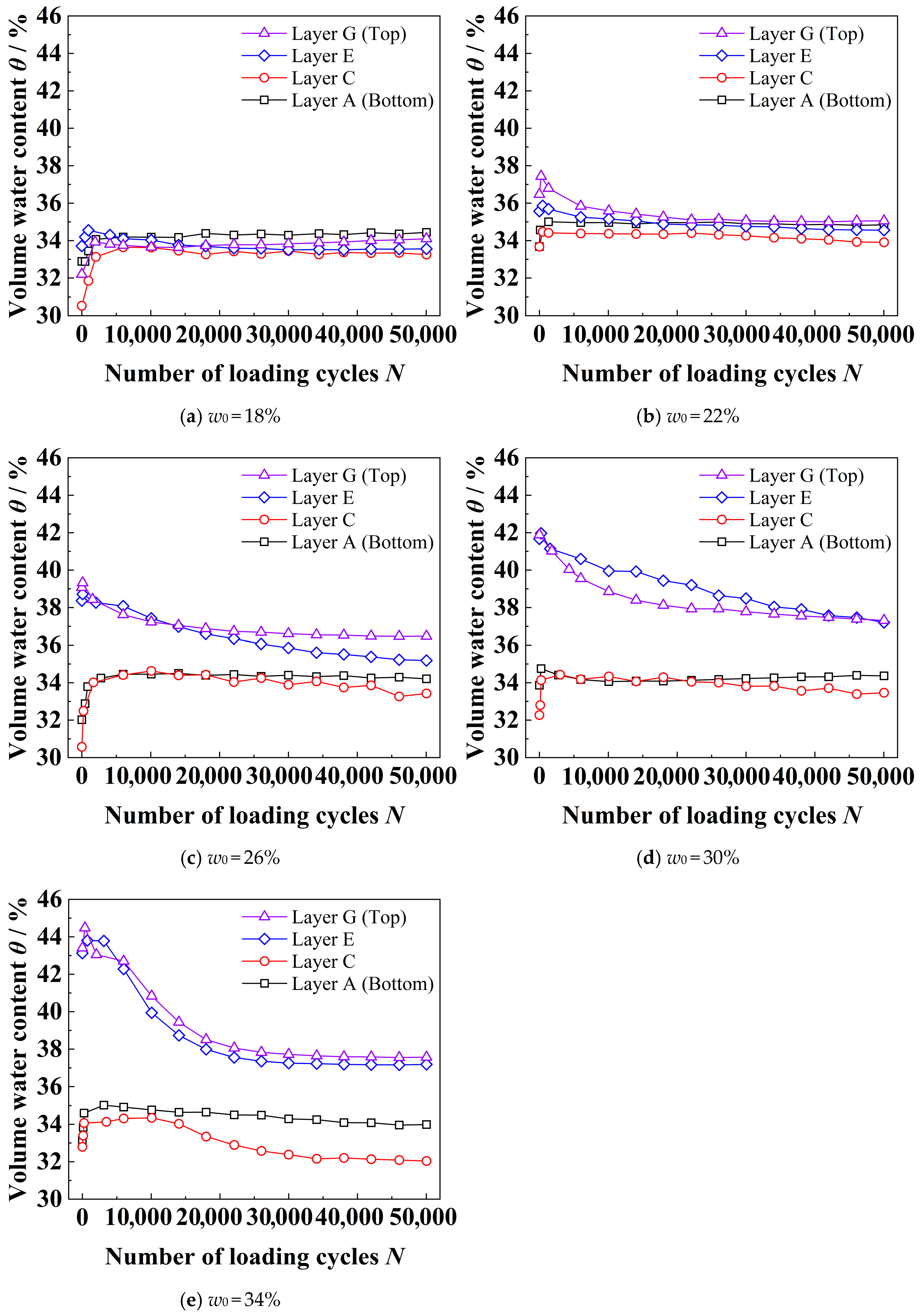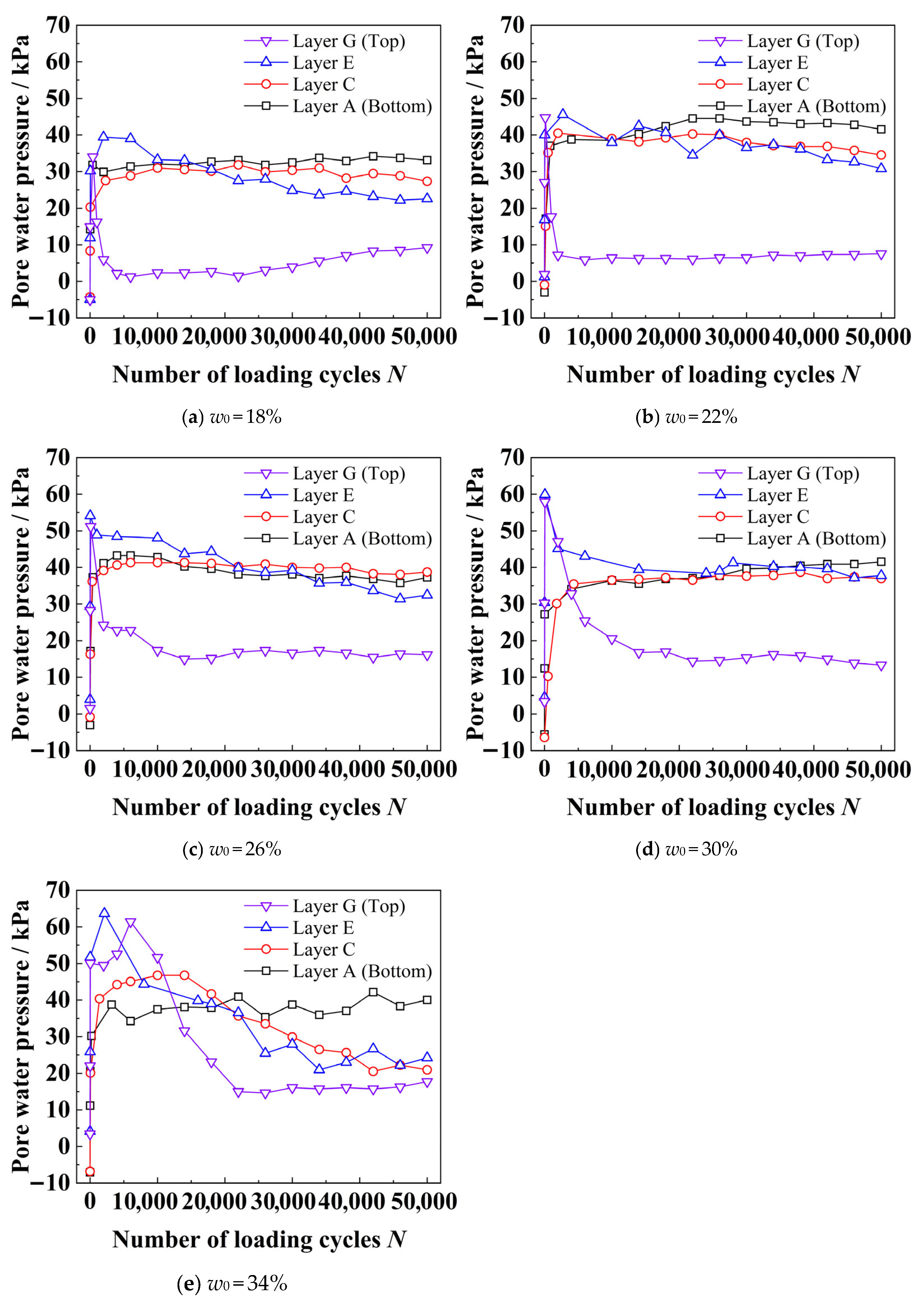 | Test No. | Cyclic Stress Amplitude (kPa) | Upper Water Content of Fine-Grained Soil (%) | Bottom Water Content of Fine-Grained Soil (%) |