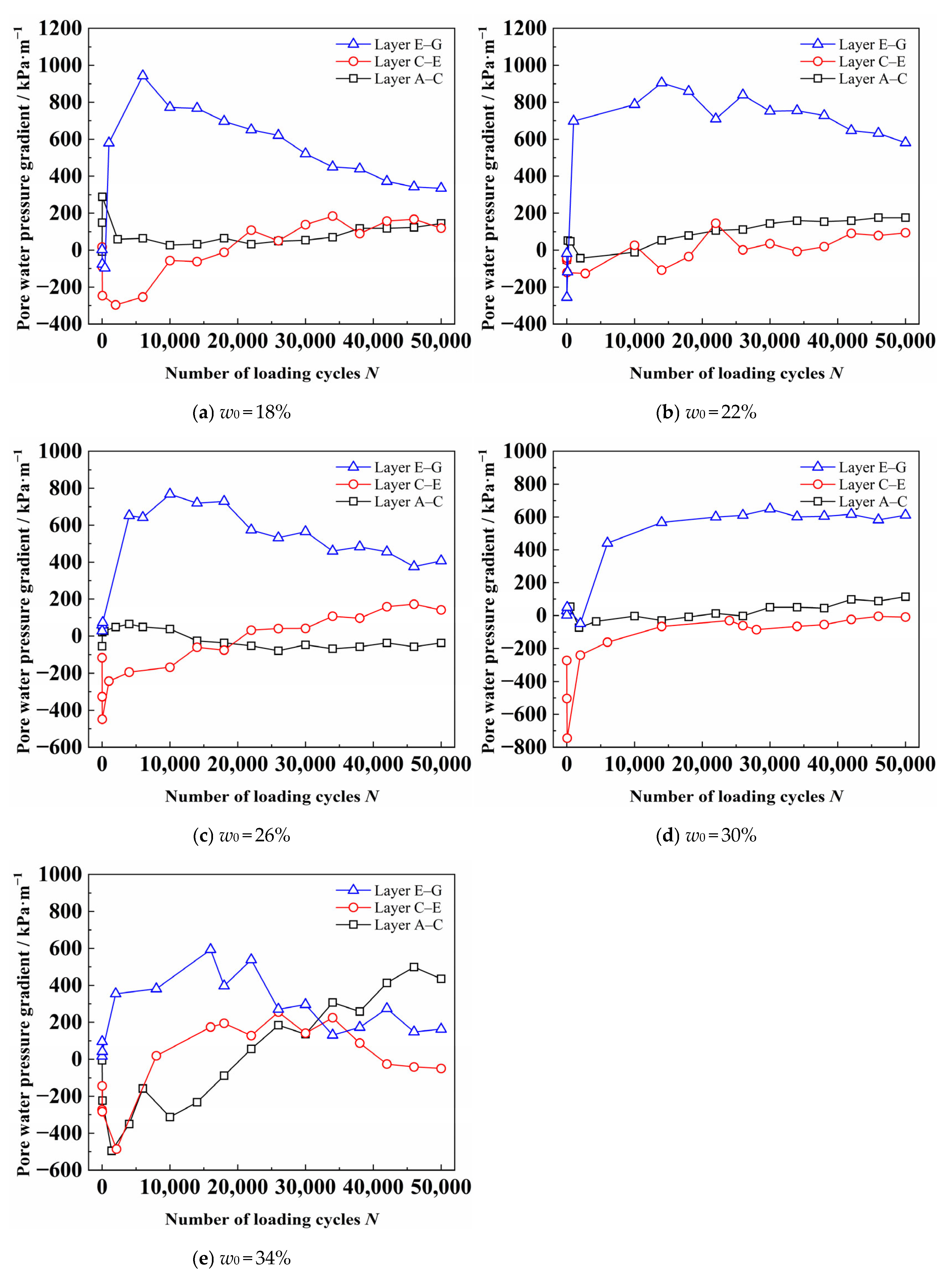 - Pore water pressure in the upper layer increased and dissipated rapidly, accompanied by a persistently positive pore pressure gradient. In the mid-upper layer, both the peak value and dissipation rate were strongly controlled by the initial water content. Meanwhile, the gradient evolves from negative toward zero as loading proceeded. In the lower layer, pore pressure accumulated gradually because of limited moisture and constrained drainage, and the gradient remained close to zero. Dissipation of excess pore pressure near the interface promoted upward moisture migration. Overall, the amount of moisture migration increased with initial water content.