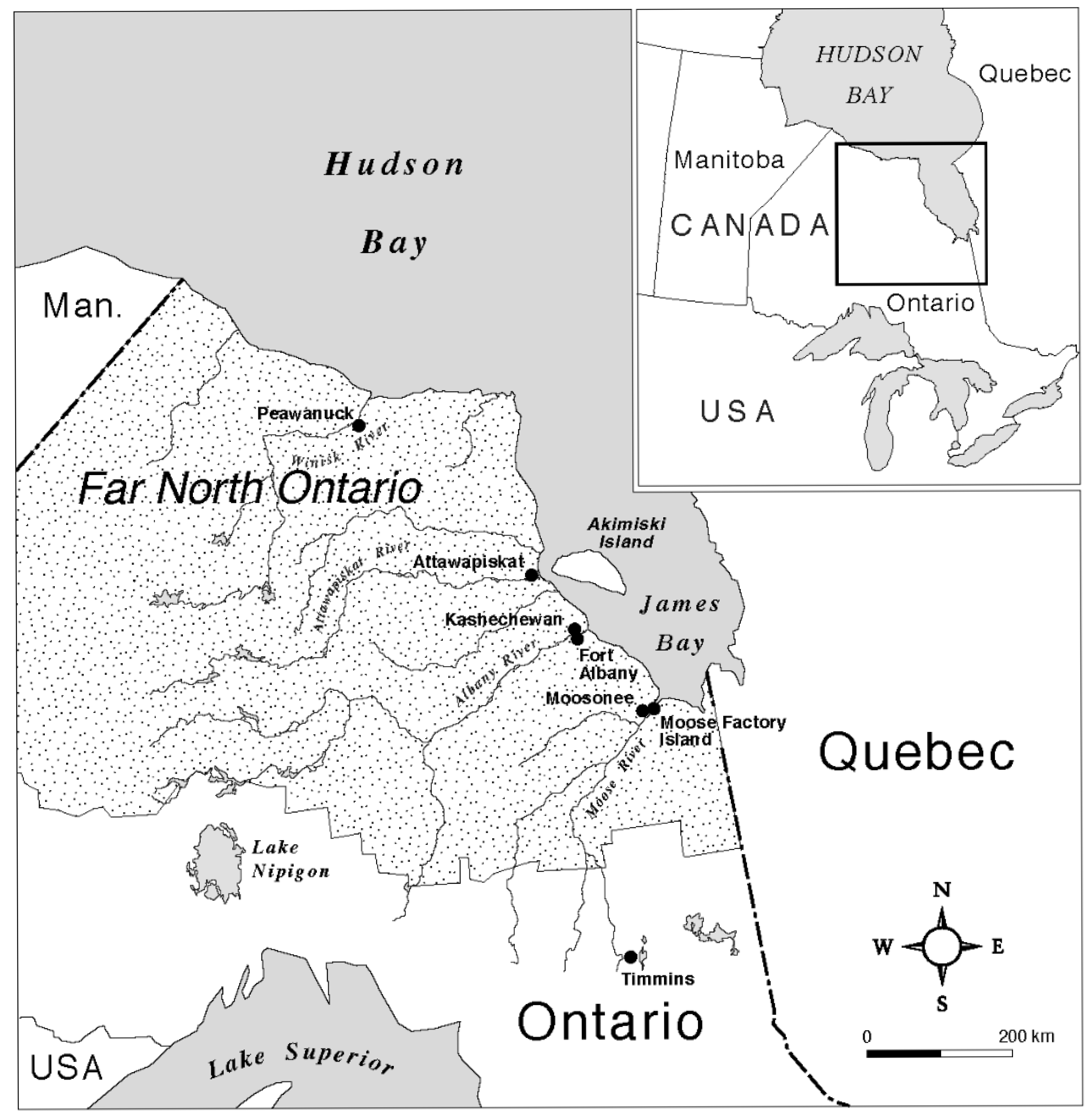 - Lytwyn, V.P. Muskekowuck Athinuwick: Original People of the Great Swampy Land; University of Manitoba Press: Winnipeg, MB, Canada, 2002. [Google Scholar]