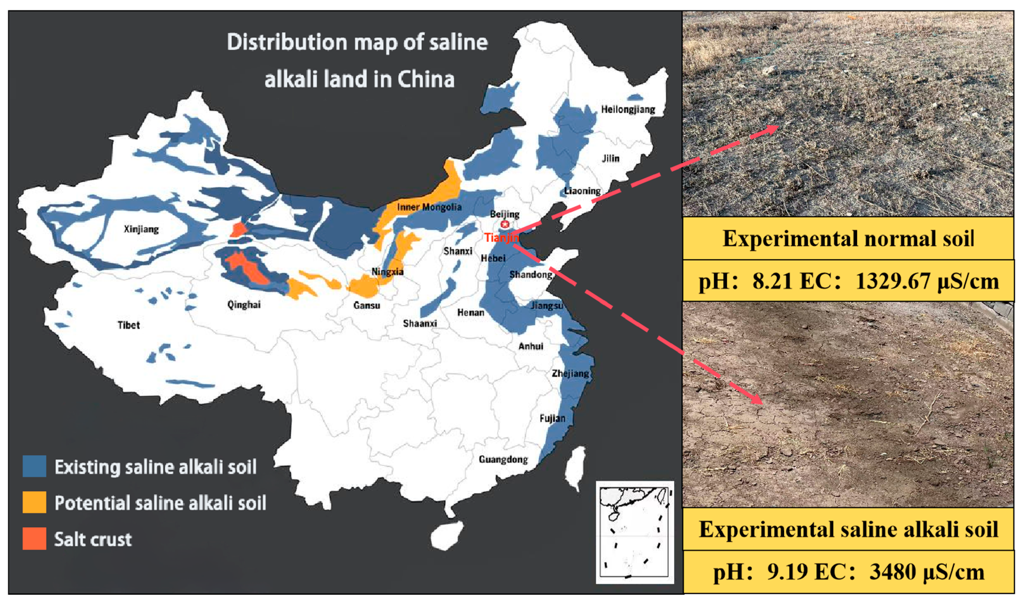 - Guo, Y.; Dong, J.; Wang, J.; Meng, Q.; Ma, J.; Luqmon, S.; Gong, P.; Reaihan, E.; Liu, H. Regional adaptability and integrated evaluation of saline-alkali soil remediation technologies: A comprehensive review. Ecol. Indic. 2025, 180, 114305. [Google Scholar] [CrossRef]
