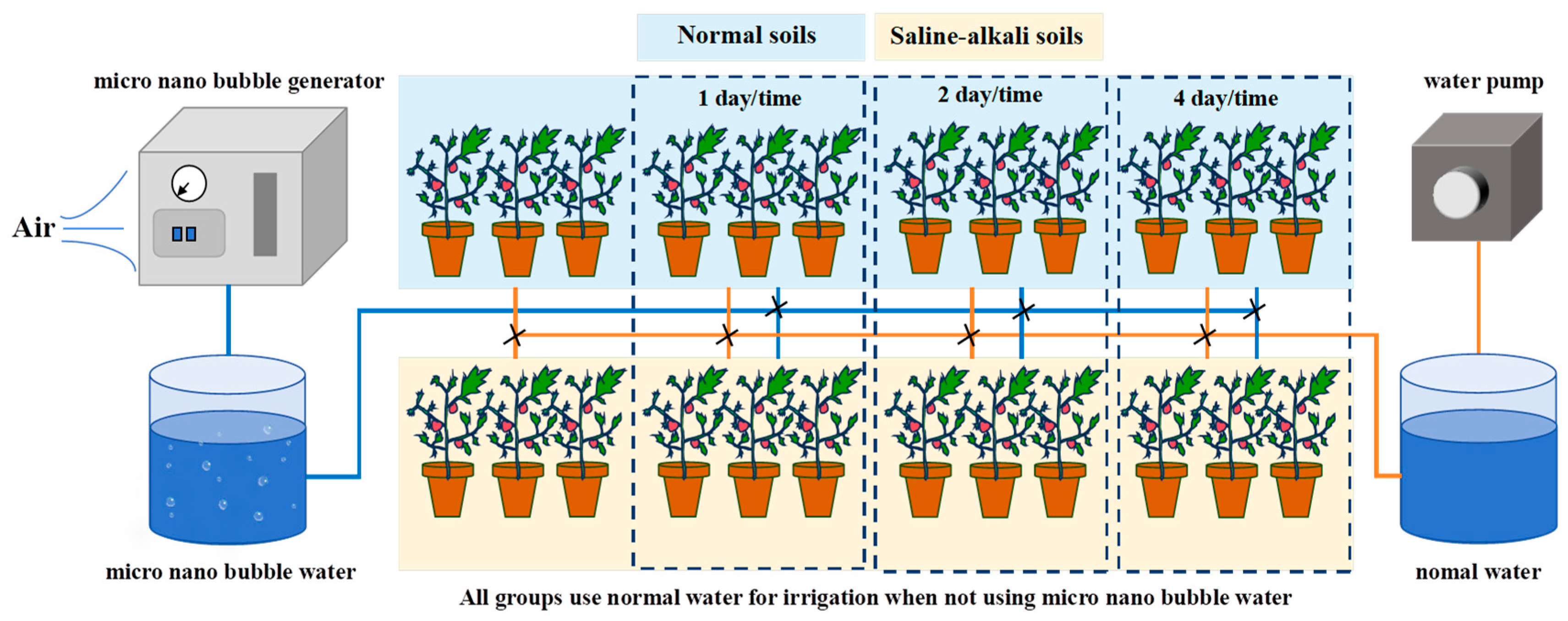 - Wang, J.; Cui, Y.; Wu, K.; Wu, S.; Wu, K.; Li, Y.; Niu, W. Micro/nanobubble-aerated drip irrigation affects saline soil microenvironments and tomato growth by altering bacterial communities. Soil Tillage Res. 2024, 239, 106034. [Google Scholar] [CrossRef]