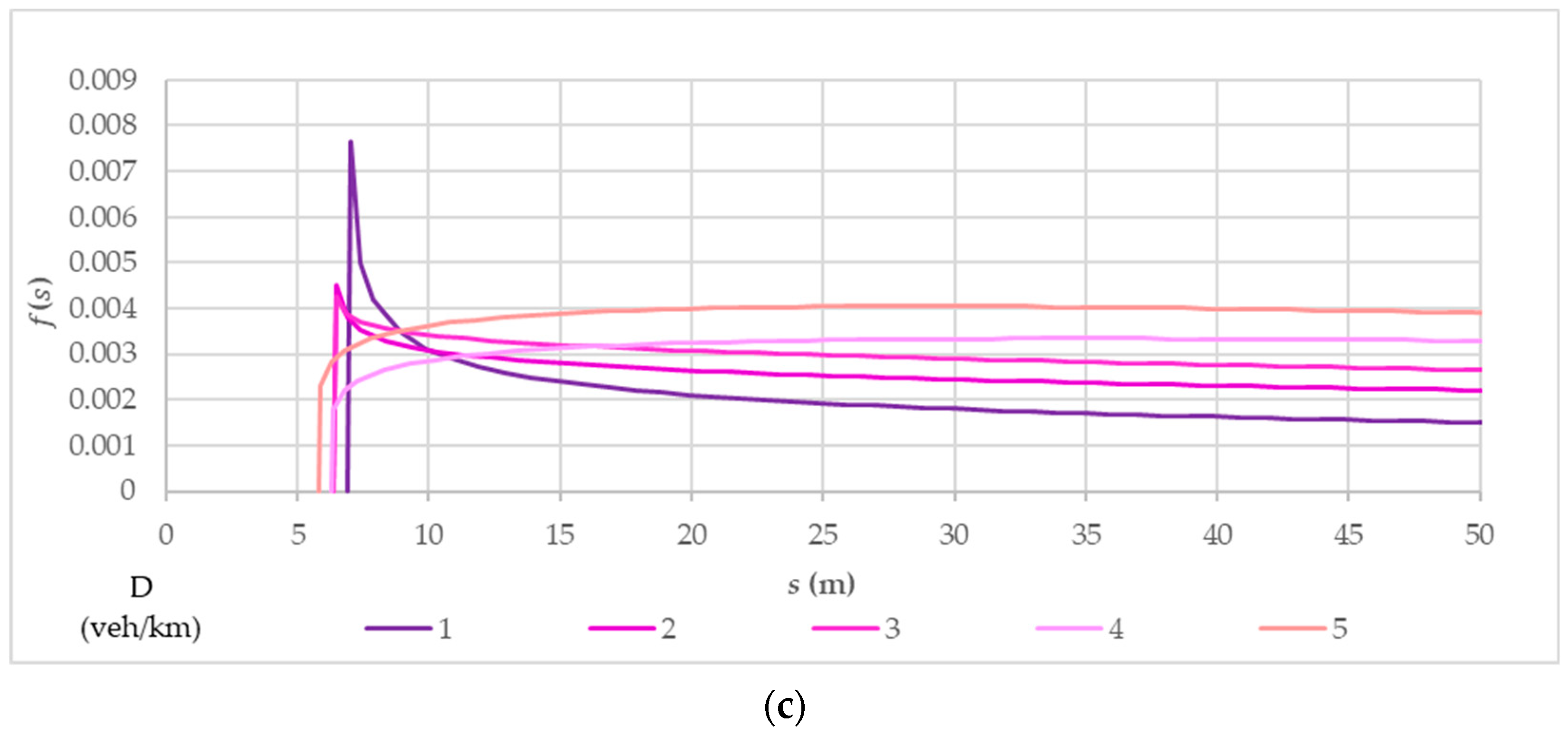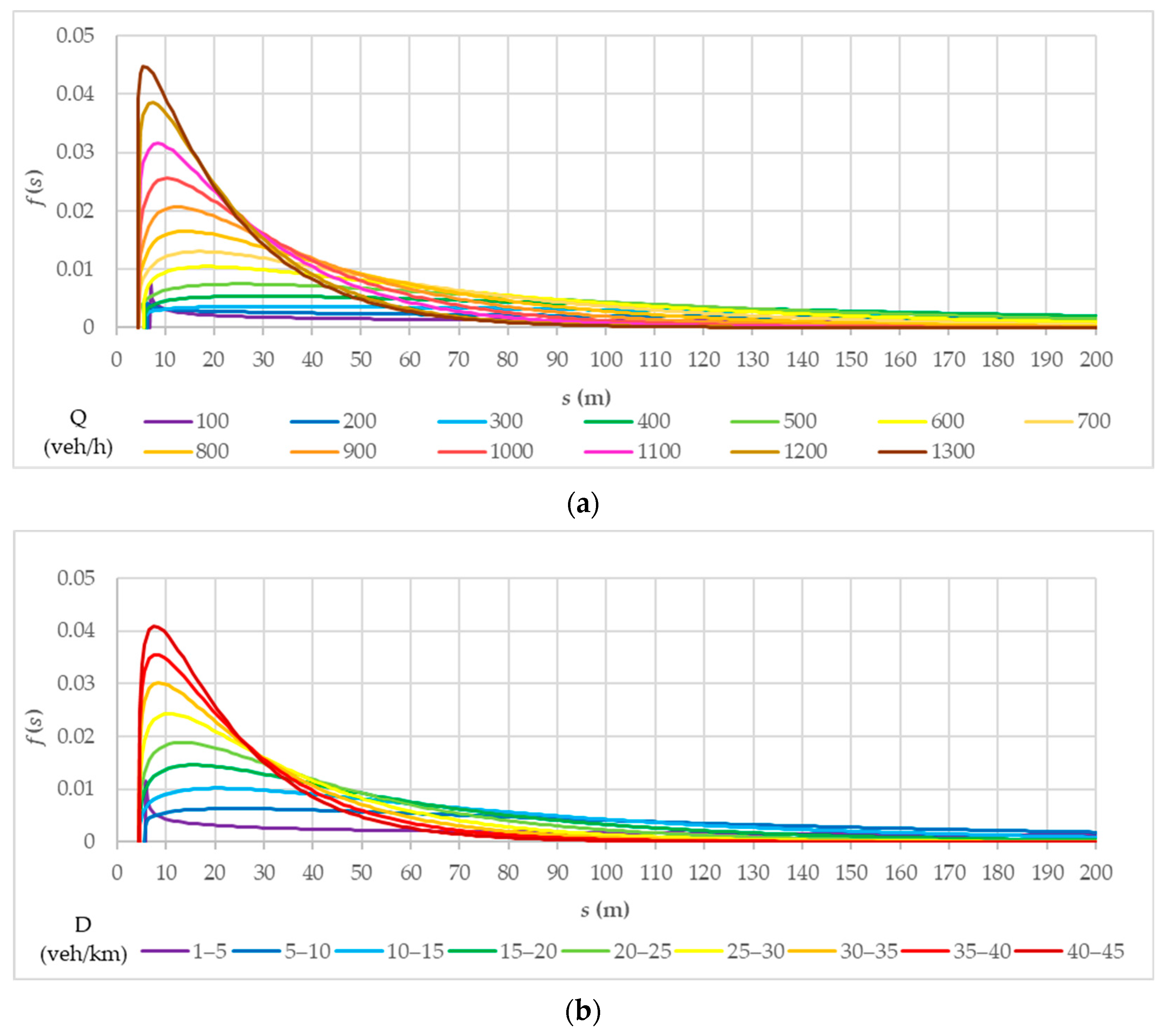 31], calibrated and validated using monitored data from a two-lane rural road section in Northern Italy, this study analyzes spacing distributions across a wide range of traffic flow rates and densities.