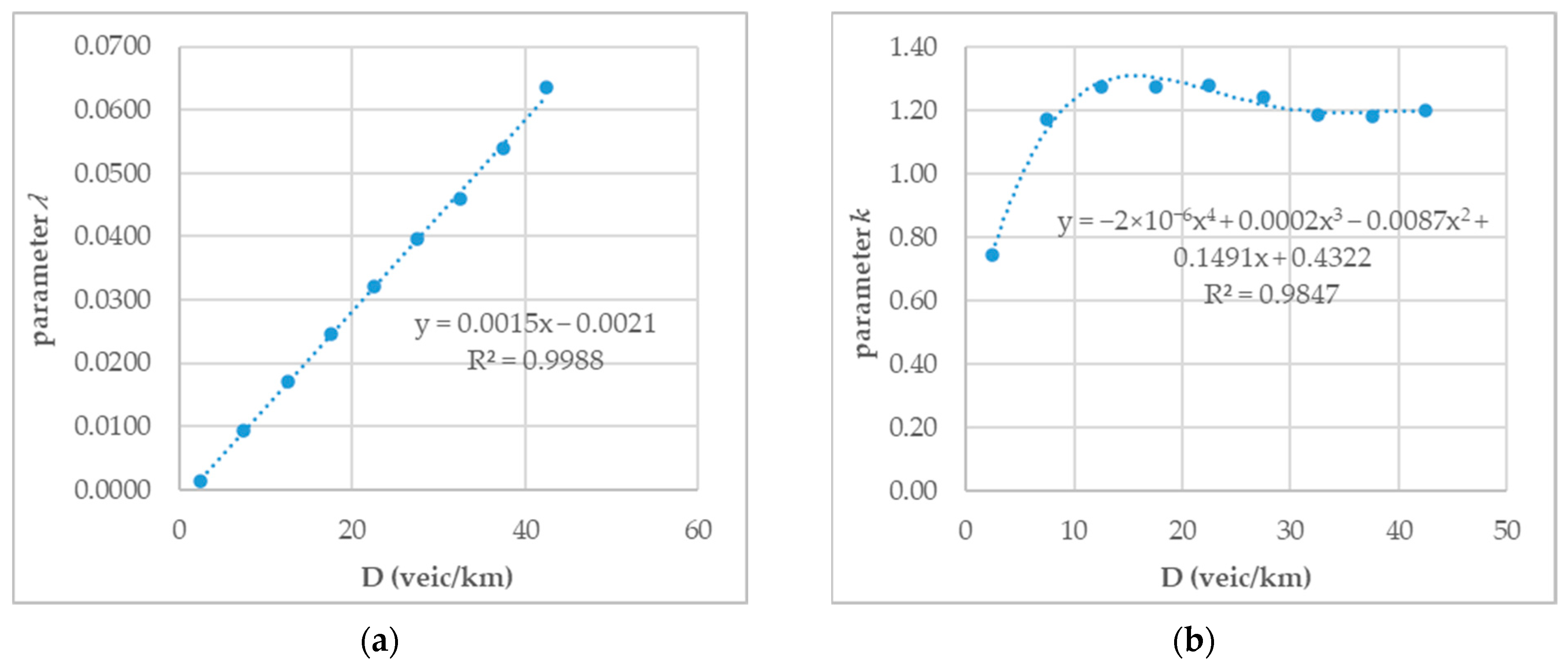 Thus, for the set of 1300 simulated series, each consisting of 100 vehicles generated by the simulation, two fitting analyses of the Pearson Type III distribution were carried out, for: simulated flow segmentation ( ranging from 100 to 1300 vehicles/hour with an increment of 100 vehicles/hour); and simulated density segmentation ( ranging from 1 to 45 vehicles/km with an increment of 5 vehicles/km). For the estimation of the parameters and in Equation (9), the MATLAB 2020a function ‘gamfit’ was used, which is based on the MLE method. This was preceded by a data shift equal to the estimated location parameter , to reduce the three-parameter Pearson Type III distribution to a standard Gamma form suitable for MLE.