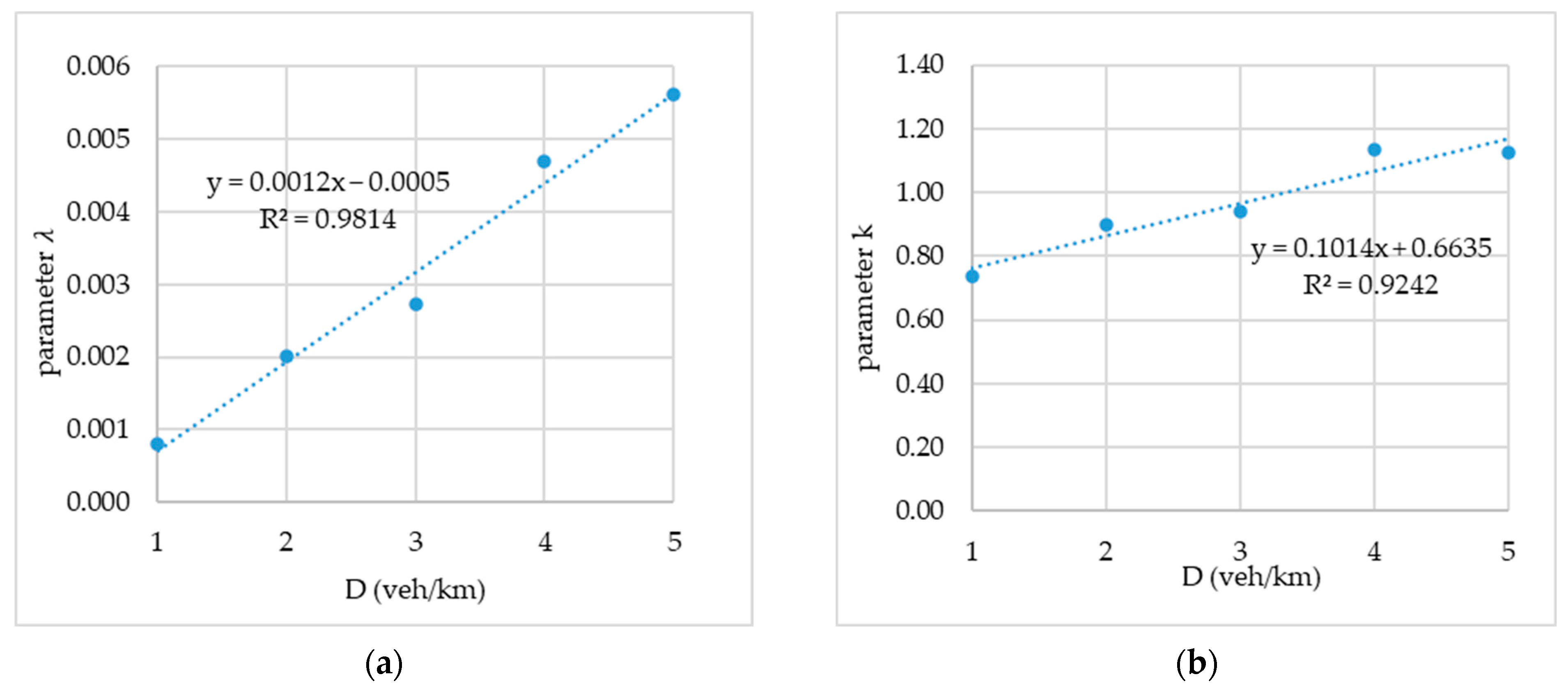 Consistent with expected driving behavior, the rate parameter increases with increasing traffic flow and density. This trend reflects a progressive reduction in average inter-vehicle spacing as traffic conditions become more congested. From a mathematical perspective, higher values of correspond to a stronger concentration of probability mass at lower spacing values, since the parameter governs the rate at which the distribution decays. As a result, larger values of indicate more compact vehicle configurations along the road axis.