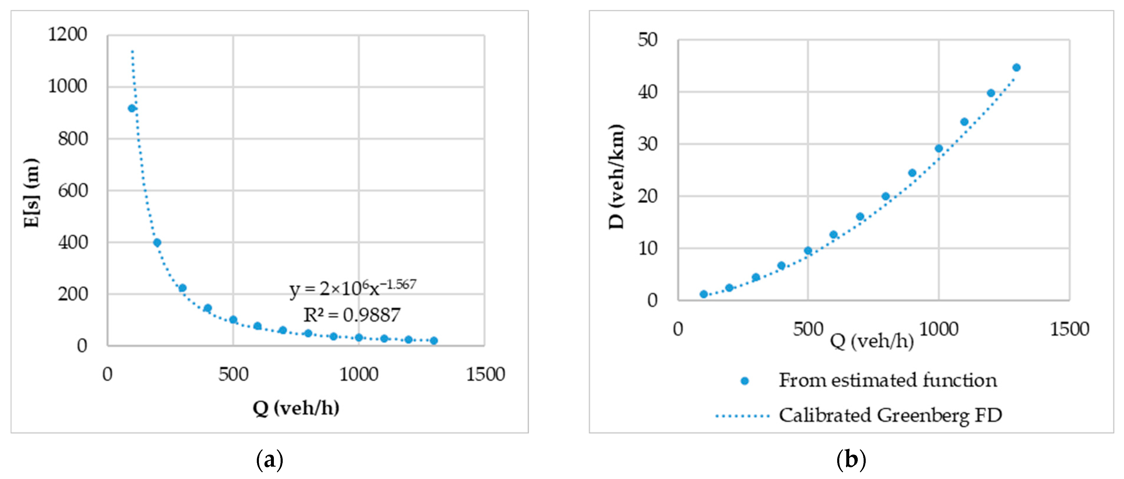 inferred from the estimated spacing distributions (vertical axis) and the trend predicted by the Greenberg macroscopic model (horizontal axis), thereby providing further support for the adequacy of the fitted probability distributions. A similar confirmation is provided by
