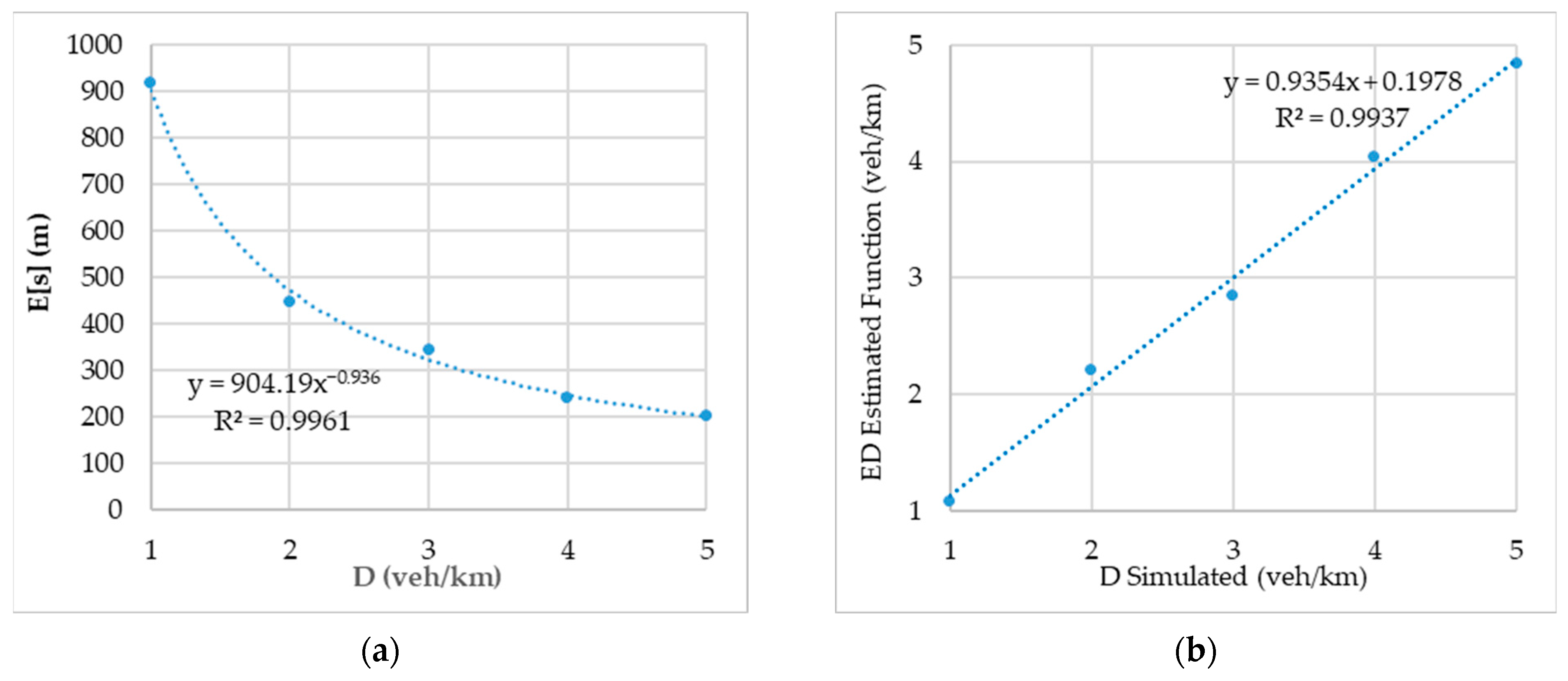 Figure 5 describe the evolution of the estimated distribution parameters as functions of traffic flow and density. These relationships provide an interpretable and analytically tractable representation of spacing dynamics and can be directly employed in safety-oriented assessments and evaluations of compliance with regulatory spacing requirements, as further discussed in this section.