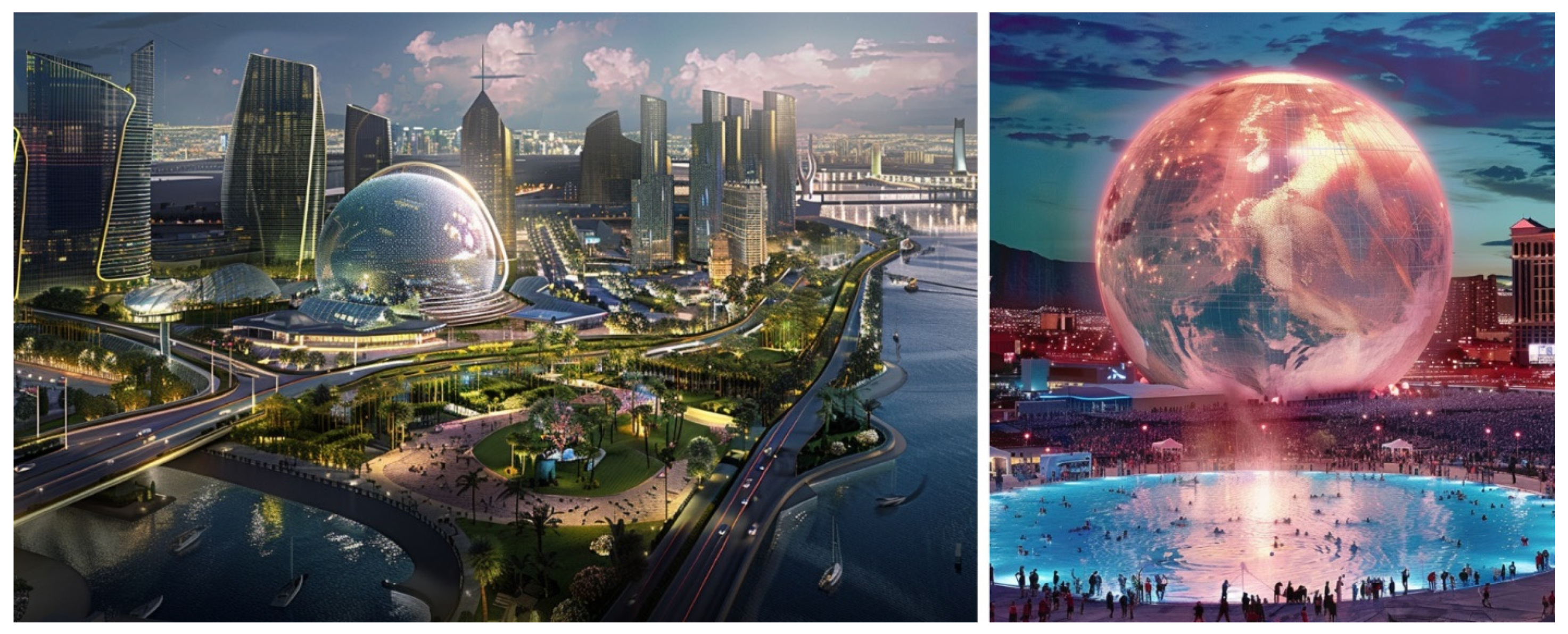 - 2: Green/blue infrastructure reads as a coherent system (e.g., greenway, waterfront park, continuous canopy) rather than isolated objects.