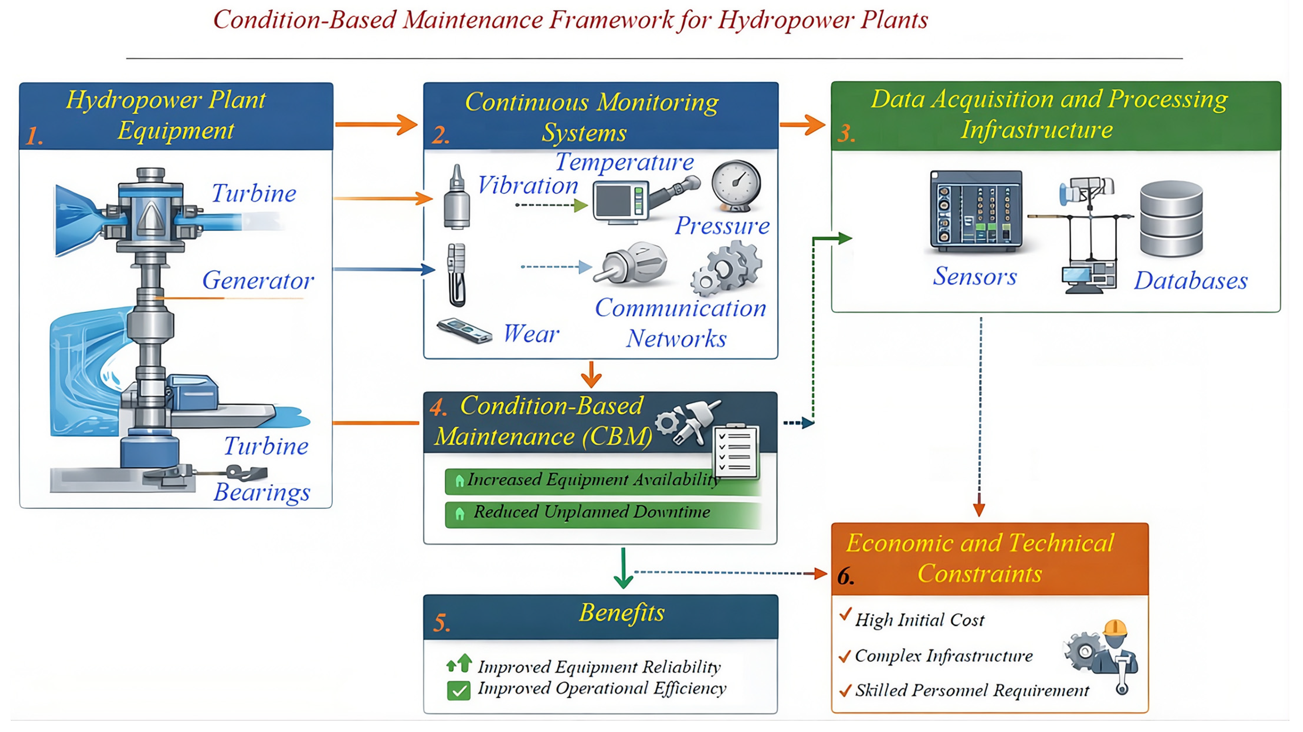21], through a systematic literature review, analyze condition-based maintenance (CBM) strategies in hydropower plants and demonstrate that this approach can increase equipment availability and reduce unplanned outages. In addition, the authors emphasize that the effectiveness of CBM is directly dependent on the implementation of continuous monitoring sensor systems. However, the high initial cost of such systems, the complexity of data acquisition and processing infrastructure, and the need for skilled personnel make condition-based maintenance strategies economically constrained or difficult to implement for many hydropower plants. Overall,