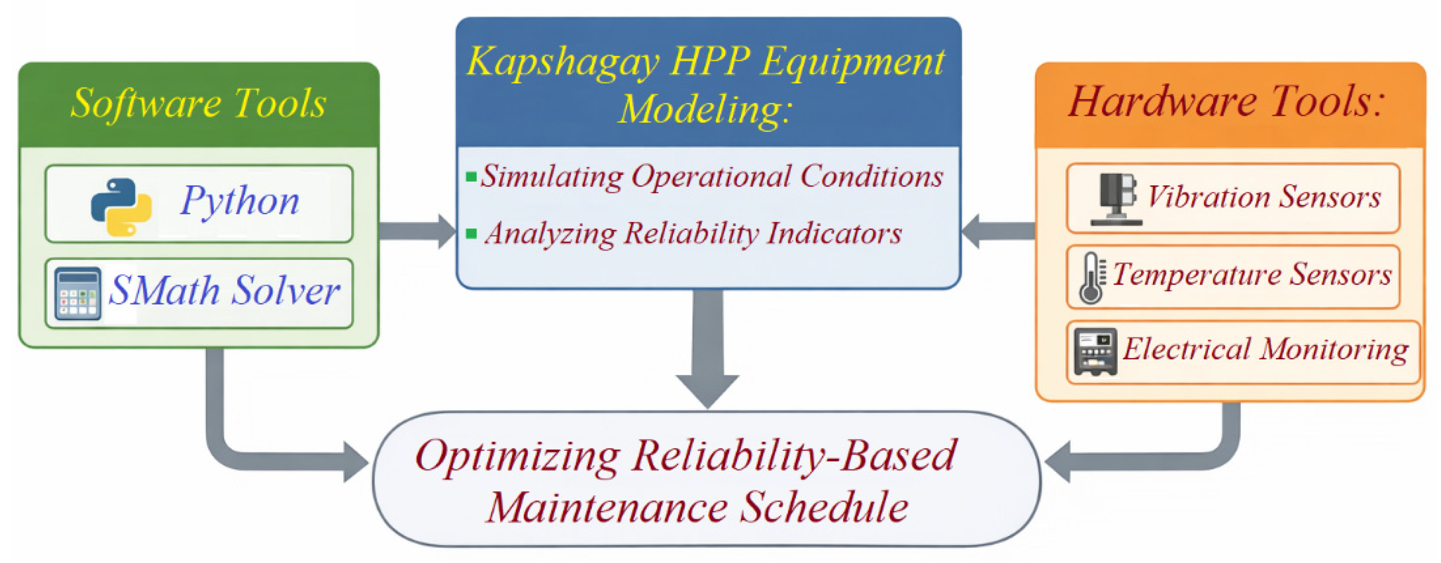Figure 4 illustrates the software and hardware infrastructure used for reliability modeling and maintenance optimization of Kapshagay HPP equipment. The modeling framework integrates Python-based numerical simulation and SMath Solver analytical calculations with real operational data collected from vibration, temperature, and electrical monitoring sensors installed on turbines and generators. These tools enable simulation of equipment operating conditions and support optimization of maintenance schedules based on reliability indicators.