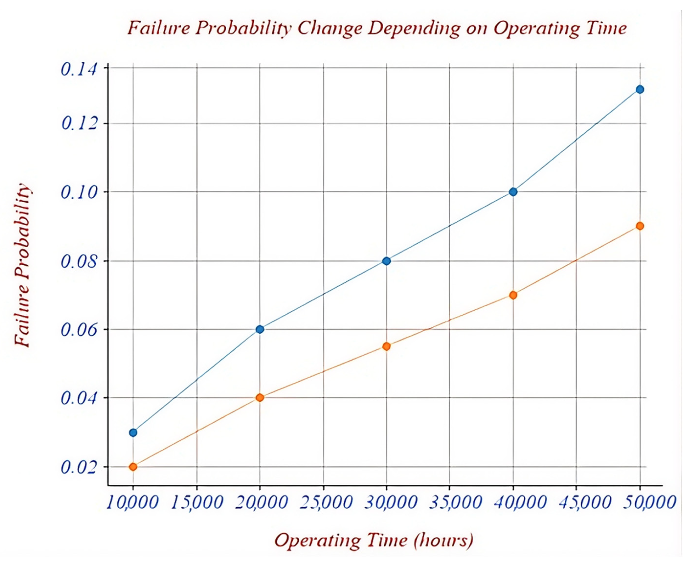 Figure 7 illustrates the variation in equipment failure probability as a function of operating time for two maintenance scenarios: the baseline maintenance model and the optimized reliability-centered maintenance model. The baseline model represents the existing maintenance strategy applied at the Kapshagay HPP prior to optimization. The optimized model reflects the proposed maintenance strategy developed in this study, which integrates reliability modeling and predictive diagnostics. The horizontal axis represents cumulative operating time (hours), while the vertical axis represents the probability of equipment failure. The orange curve corresponds to the baseline maintenance strategy, whereas the blue curve represents the optimized reliability-centered maintenance model.