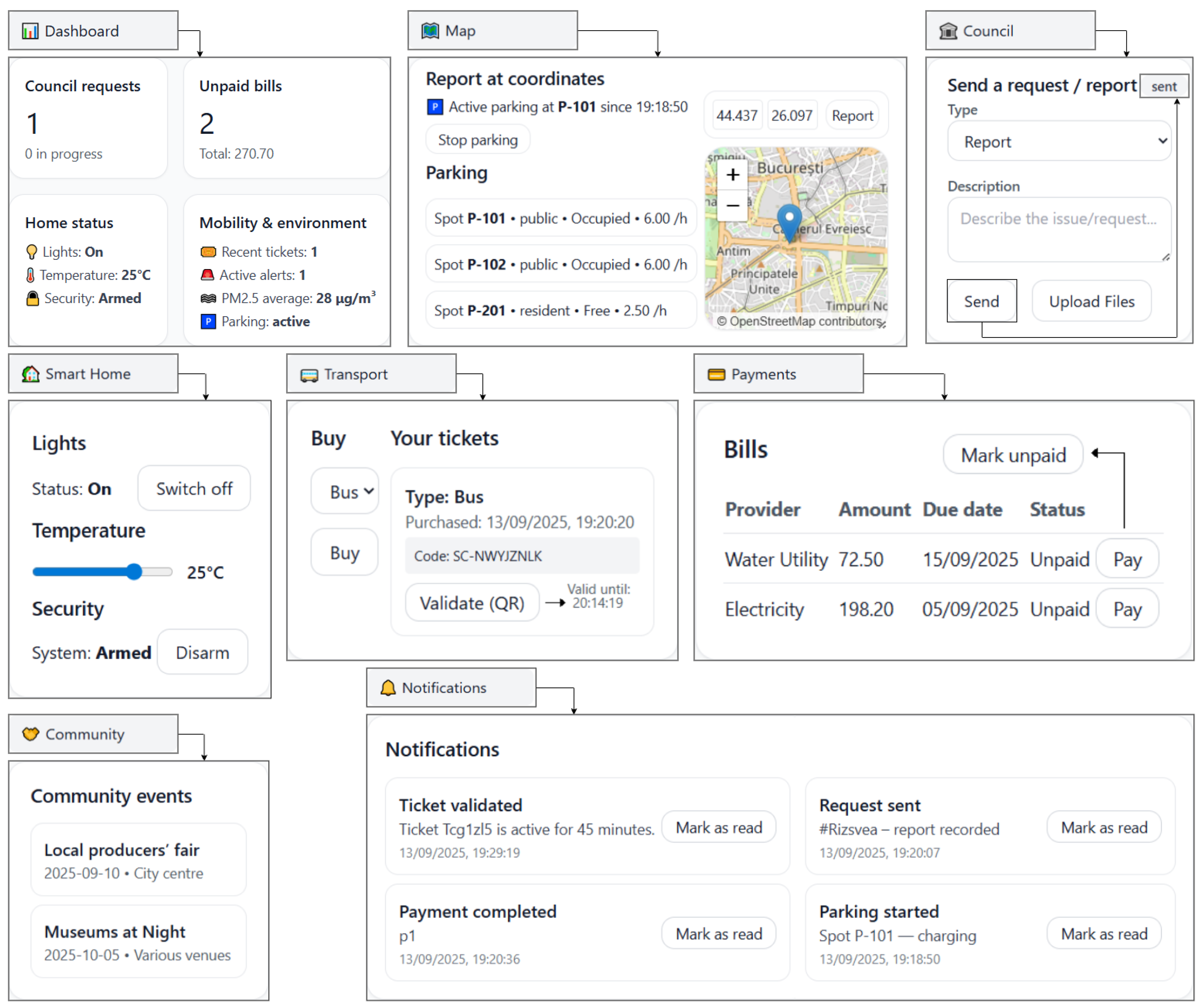 | [47] | Romanian Municipalities and the Smart city Framework | Electronic government (e-government), mobile (Tranzy), smart street, public Wireless Fidelity (Wi-Fi), waste sensors, open data. | Comparative analysis of the most notable projects implemented in Cluj-Napoca, Iași, and Alba Iulia, across six components: governance, quality of life, citizen, environment, infrastructure/mobility, and economy. Includes site visits and municipal sources. | Ranking of projects in 2023: Cluj-Napoca 63, Iași 56, Alba Iulia 49. Covers implementations in the areas of transport, e-services, and environment. | Smart initiatives are still in early stages. Public information is limited. Some projects are delayed or unfinished. |
