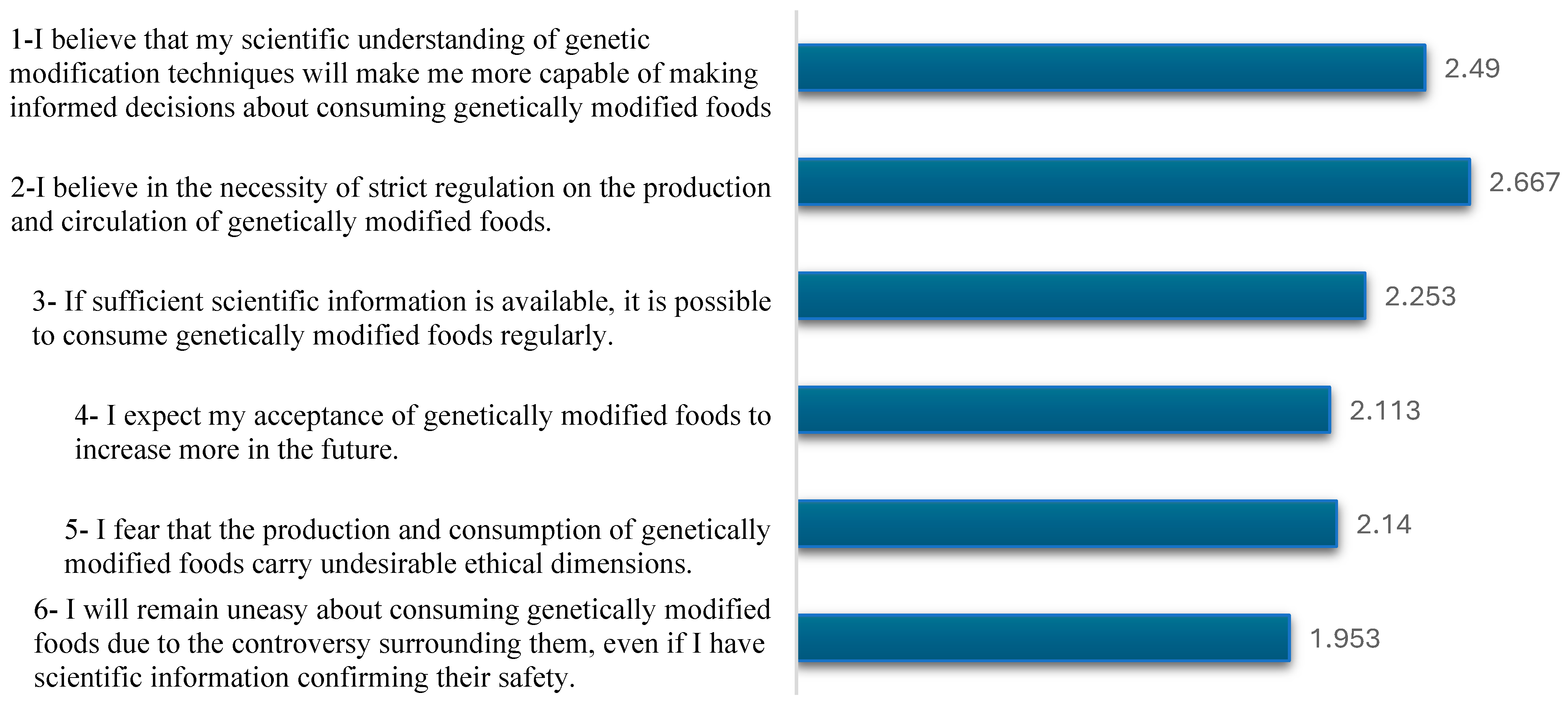 | 2 | Genetically modified foods can be more resistant to pests and diseases, which reduces the use of pesticides. | 42.7 | 31.3 | 26.0 | 2.167 | 0.813 |