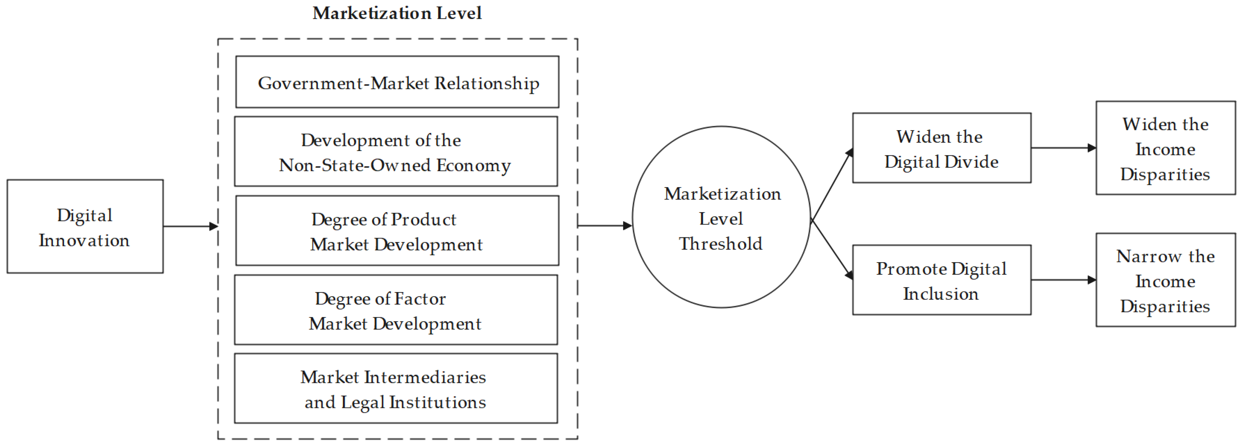 According to the theory of institutional complementarity, the economic benefits of digital innovation are influenced by the market-oriented institutional environment. The impact of the marketization level can be analyzed along five dimensions. In regions where the government–market relationship is distorted, the non-state-owned sector is underdeveloped, product markets are segmented, factor market development is insufficient, and market intermediaries are weak. Institutional deficiencies impede the effective integration of digital resources, forming a “digital divide” and causing digital innovation to widen the income gap. Conversely, when government intervention is moderate, the private economy is vibrant, product and factor markets are highly integrated, and the legal environment is sound. A favorable institutional environment facilitates the inclusive distribution of digital dividends. This enables digital innovation to narrow the income gap by reducing transaction costs and enhancing production efficiency. The coordinated evolution of these five dimensions and the overall level of marketization may create a marketization threshold, which affects whether digital innovation widens or narrows the income gap. The threshold effect is shown in