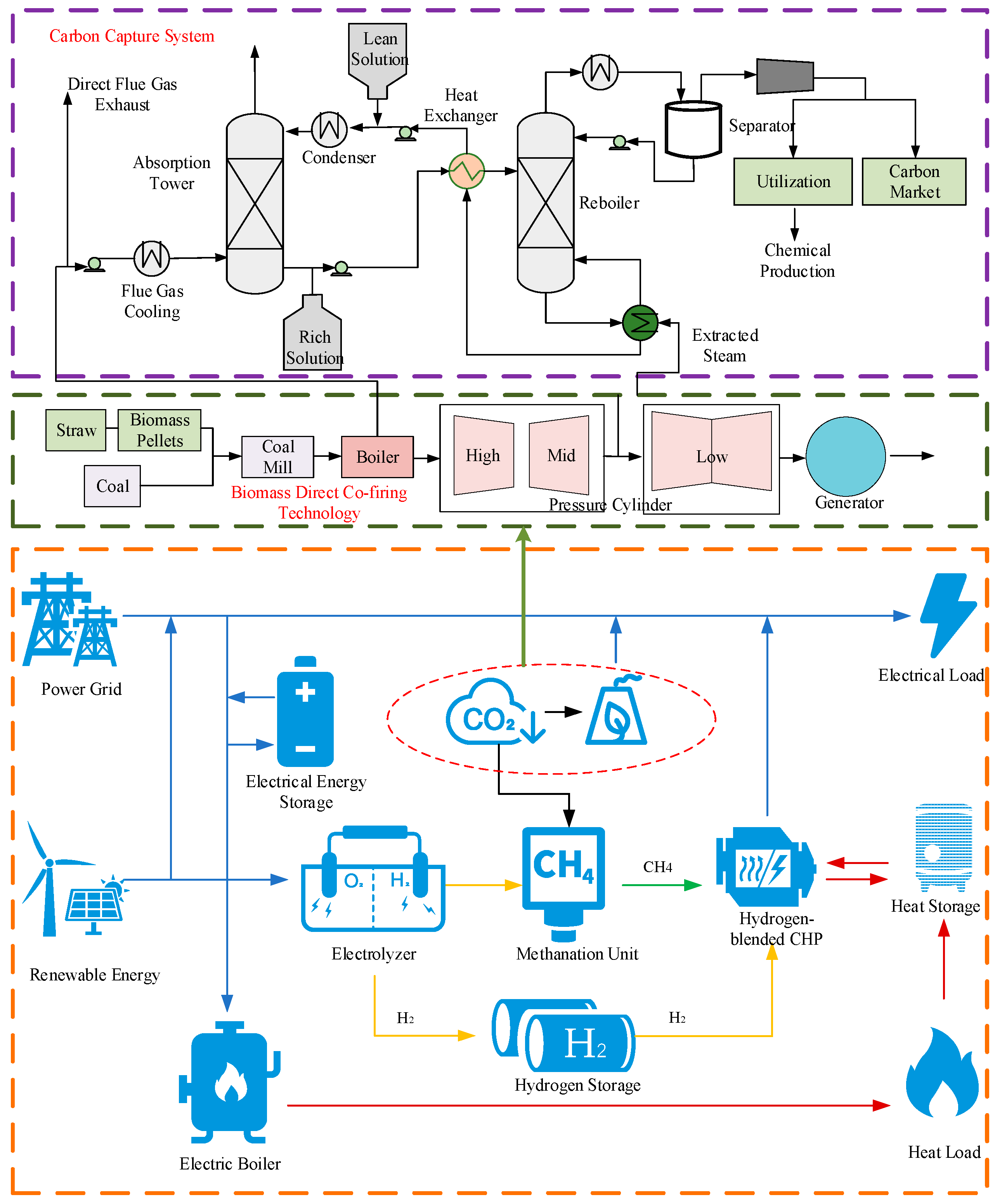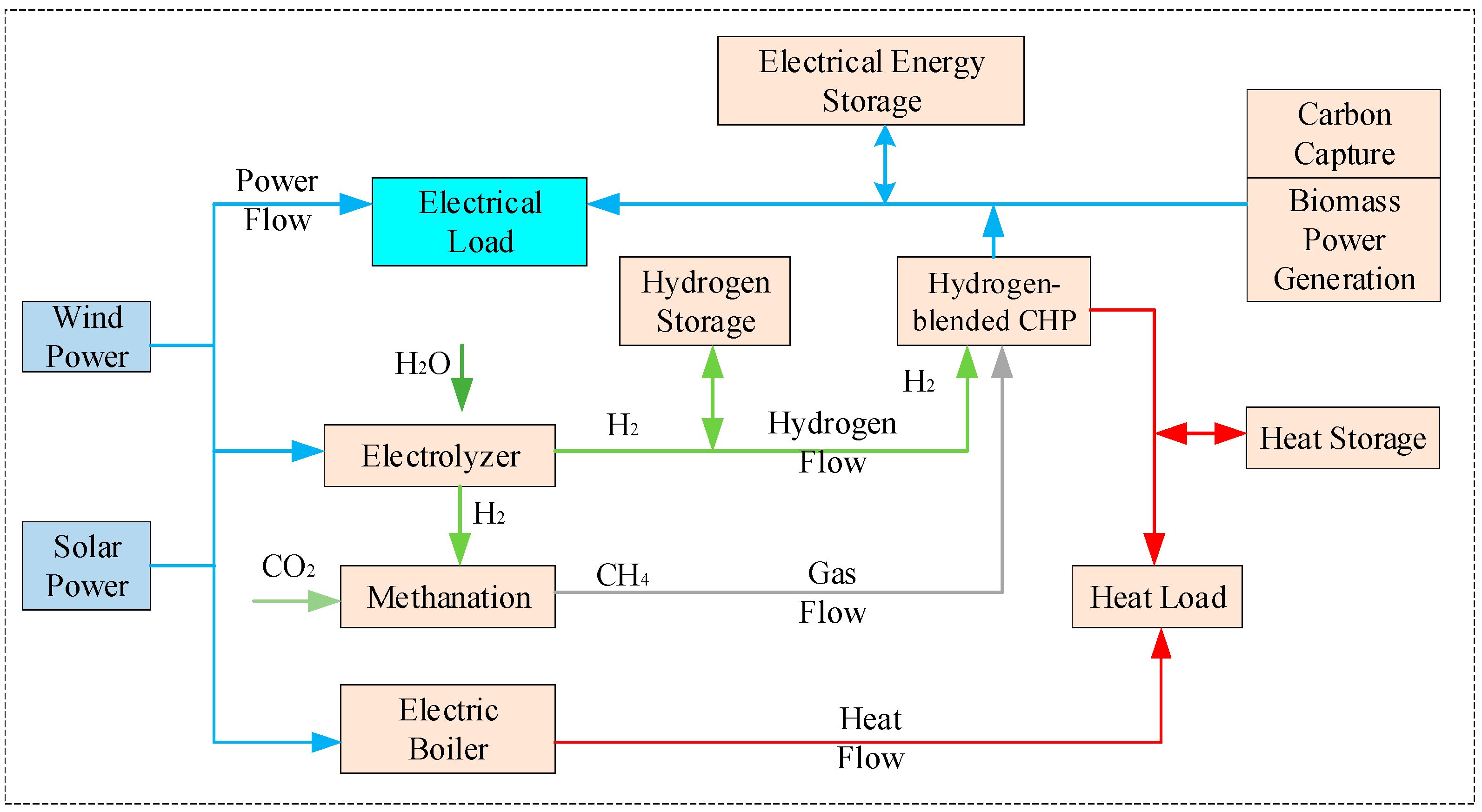 Scenario 1 (Proposed): Incorporates the full electro-carbon–hydrogen coupling mechanism. It includes renewable energy, thermal power, CHP, P2G, CCS, and biomass co-firing. Crucially, it enables cascading utilization where hydrogen can be both blended into gas turbines and used for methanation.