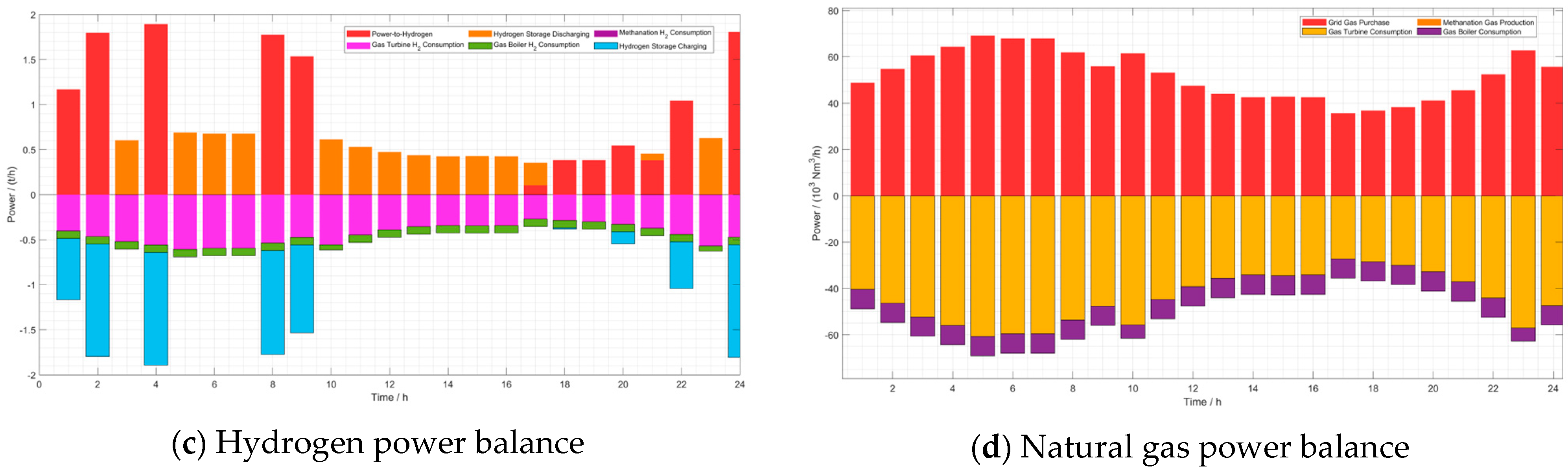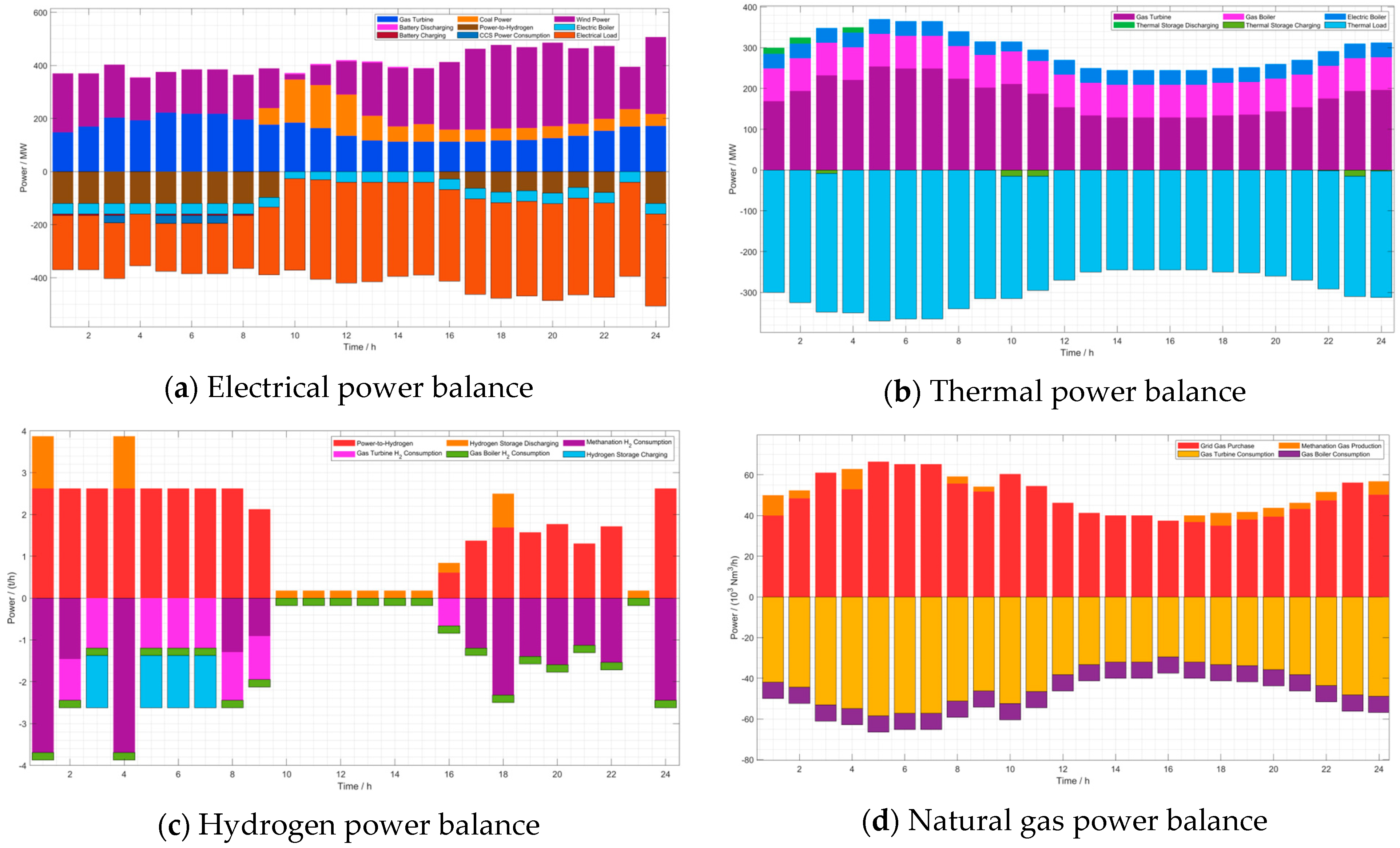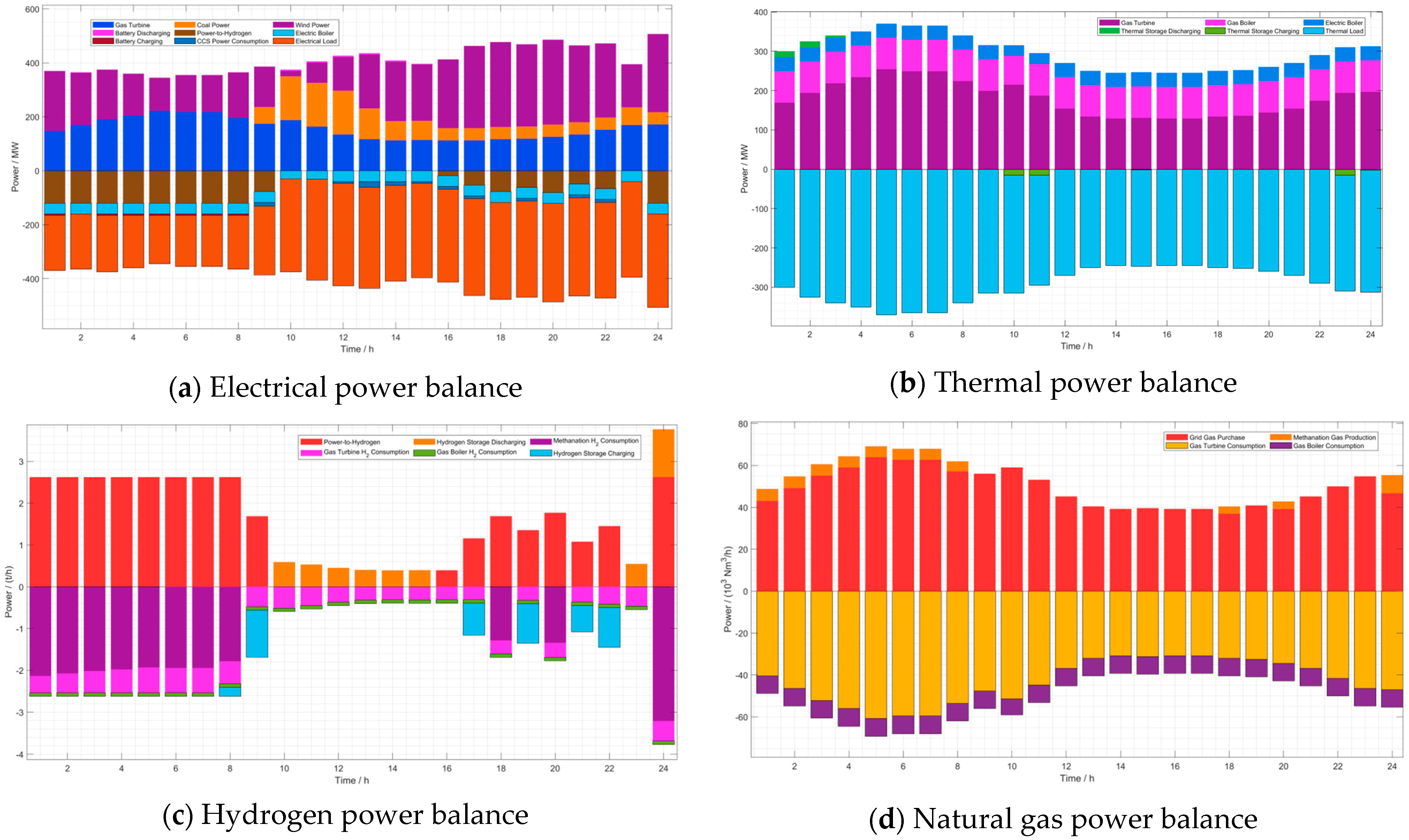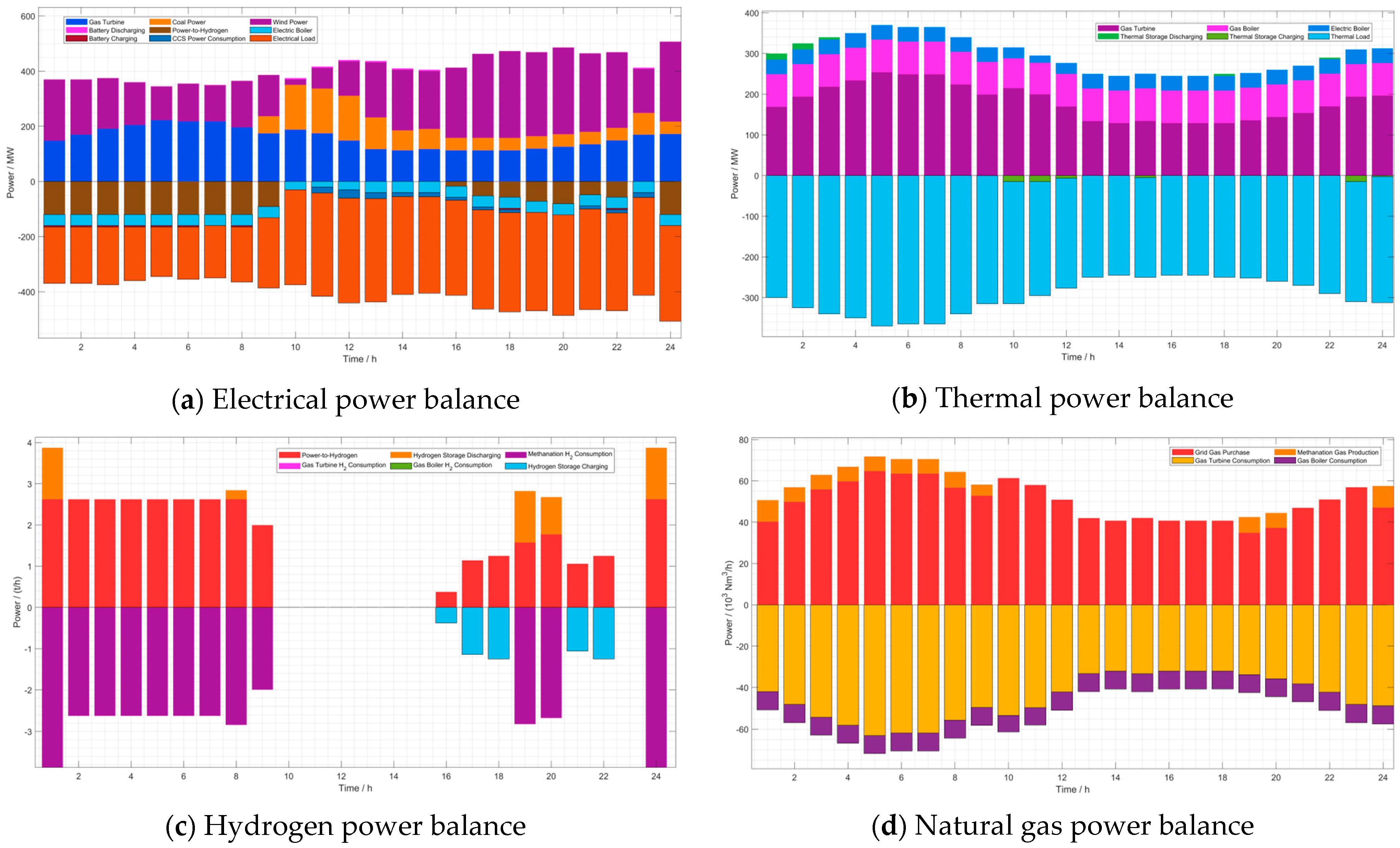 The power balance results for the proposed Scenario 1 (with a fixed 10% hydrogen blending ratio) are illustrated in