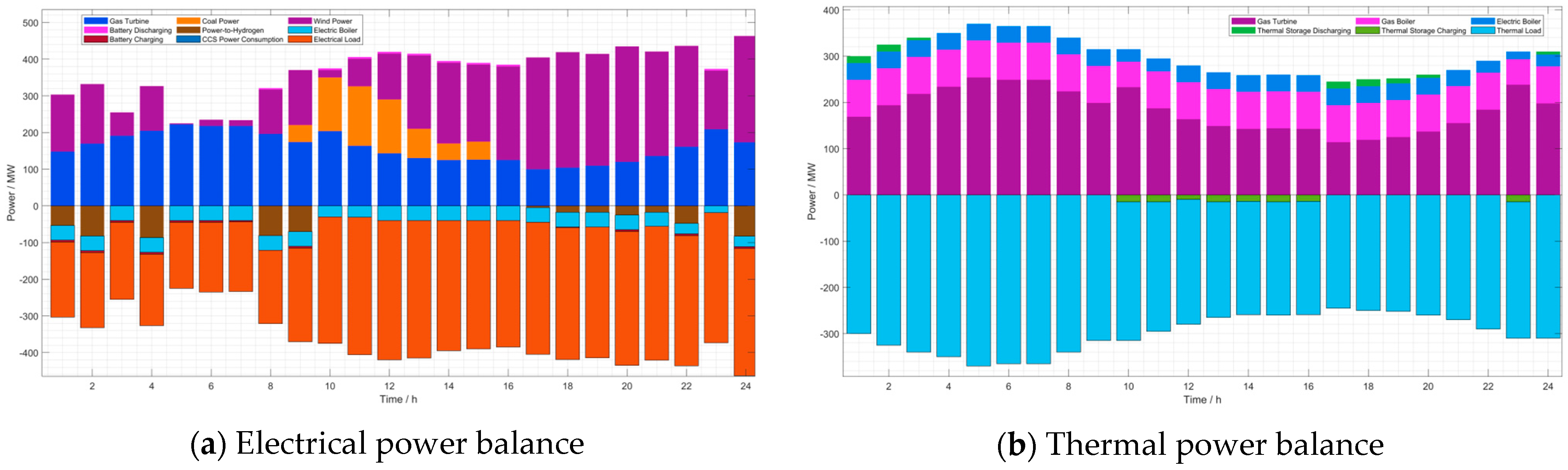 Figure 3a, during the peak renewable generation period (12:00–15:00), the system achieves a high accommodation rate of wind and solar power compared to Scenario 2. The thermal power unit ramps down to its minimum stable output (50 MW) during the load valley (02:00–05:00) to minimize fuel consumption and cycling costs. The thermal supply exhibits a “double-peak” characteristic (07:00–09:00 and 18:00–20:00). The CHP unit and electric boiler operate synergistically to meet heating demands, avoiding the high carbon emissions associated with pure gas boilers. The hydrogen and natural gas balances (