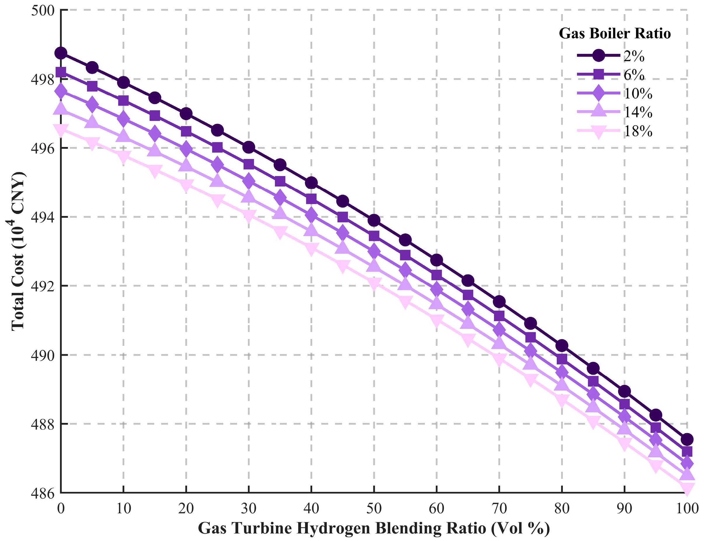 Scenario 4 (Variable Conditions): Based on Scenario 1, this scenario further investigates the system’s performance under variable hydrogen blending ratios and changing operating conditions to analyze adaptability and economic robustness.