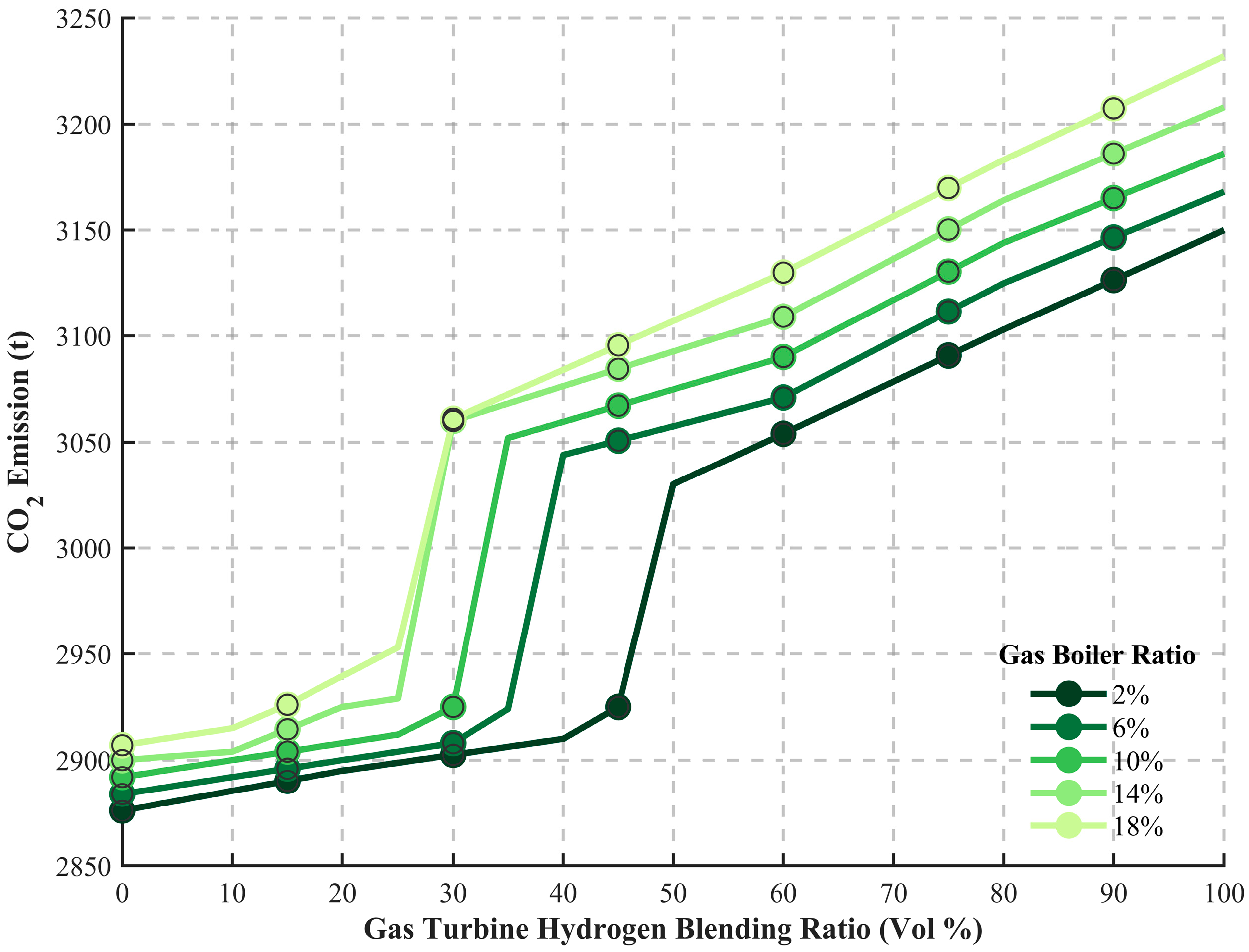 To validate the robustness of the model, Scenario 4 introduces a variable hydrogen blending ratio ranging from 0% to 20%. Although pushing the hydrogen blending ratio to higher levels (e.g., 20–50%) could theoretically yield deeper emission cuts, such scenarios are excluded from this analysis. Ratios above 20% currently exceed the safe operational thresholds of standard commercial gas turbines and would require substantial capital investment for specialized equipment retrofits, which falls outside the economic scope of the proposed short-term adaptive scheduling framework.