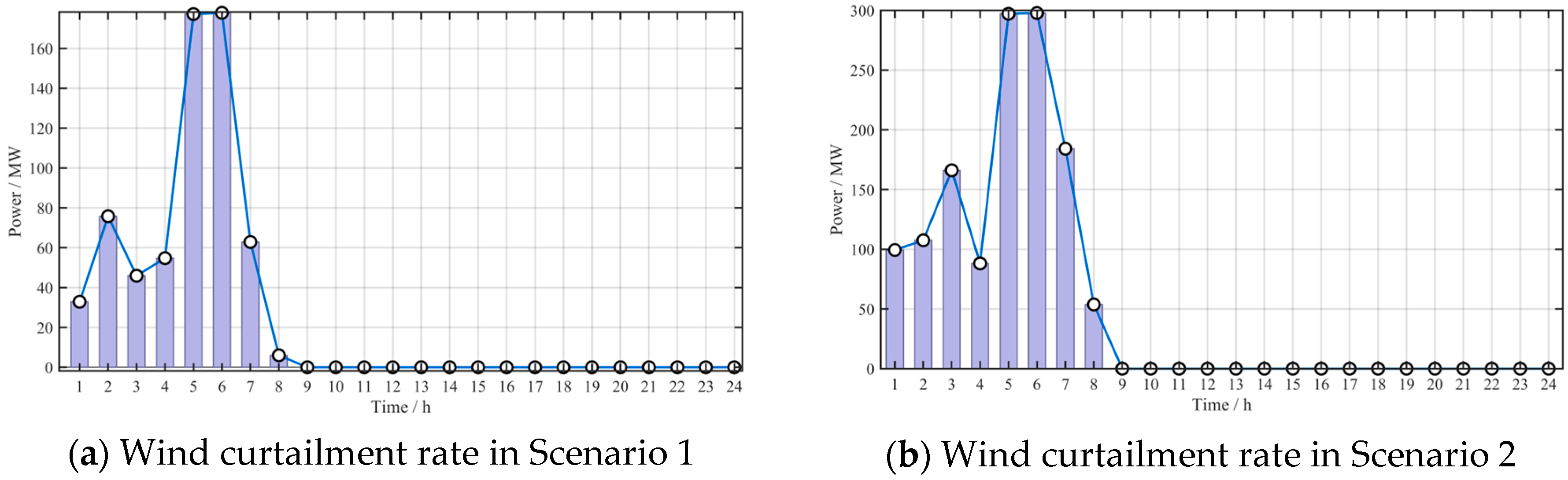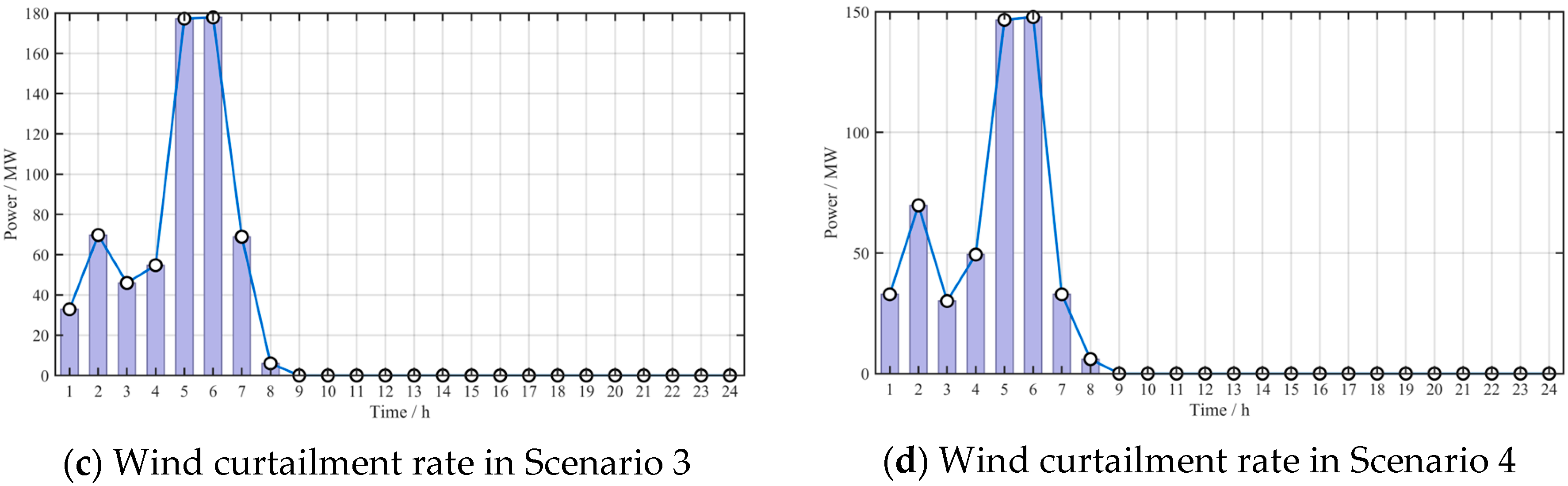 Figure 9 compares wind curtailment across the scenarios. Scenario 1 (a) and Scenario 4 (d) significantly reduce the peak curtailment compared to Scenarios 2 and 3. The variable operating condition in Scenario 4 further lowers the average curtailment per period, validating its capability to accommodate renewable fluctuations.