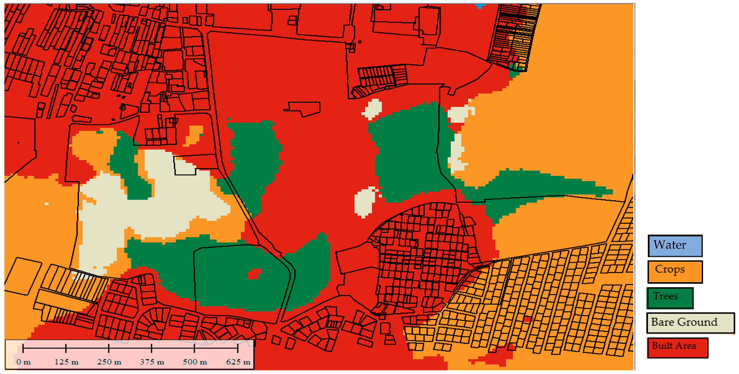The current condition of the University’s grounds can be evaluated using topographic maps, plans, satellite imagery, and aerial photographs. The LULC (Land Use Land Cover) model, depicted in