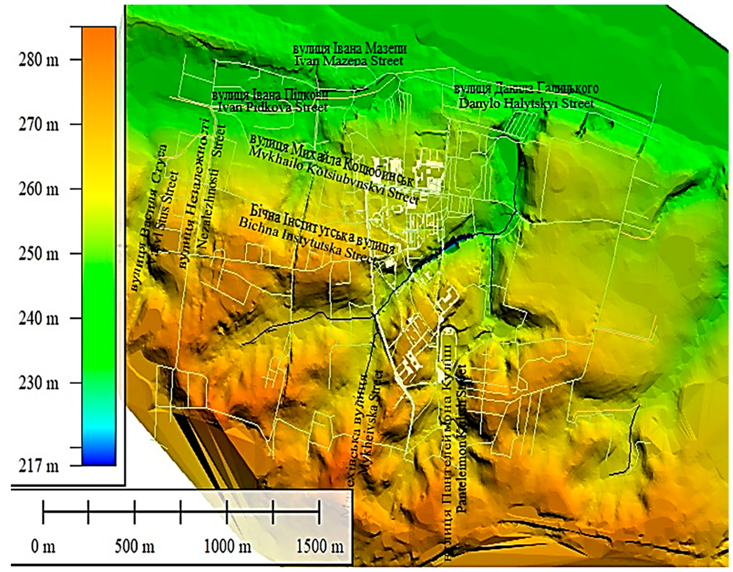 38], in Dubliany, Lviv region, the geoid’s height above the ellipsoid’s surface ranges from 3969 cm in the southeastern outskirts to 3971 cm in the northwestern outskirts. The relief display isoclines are depicted in blue in