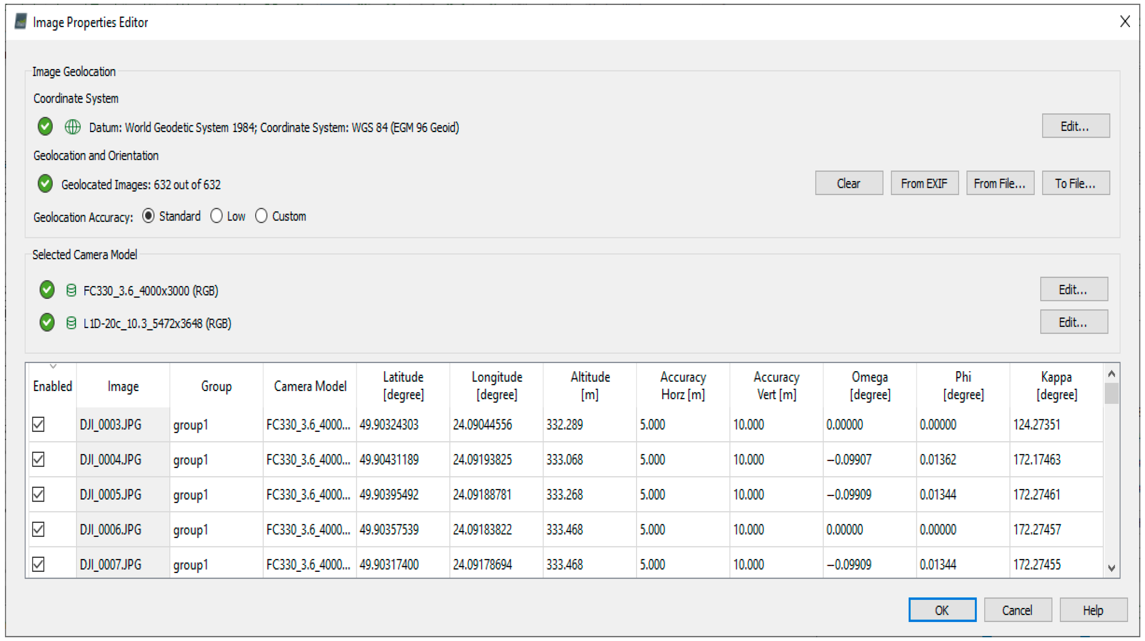 The peculiarity of this project is that there are no GPS track files and records of the IMU module, which records navigation parameters, namely the angles of rotation and tilt of the images at the time of their acquisition. In all three blocks, the images were geolocated in the WGS84 coordinate system with visualization of the graphical scheme of projection centers on the electronic map (