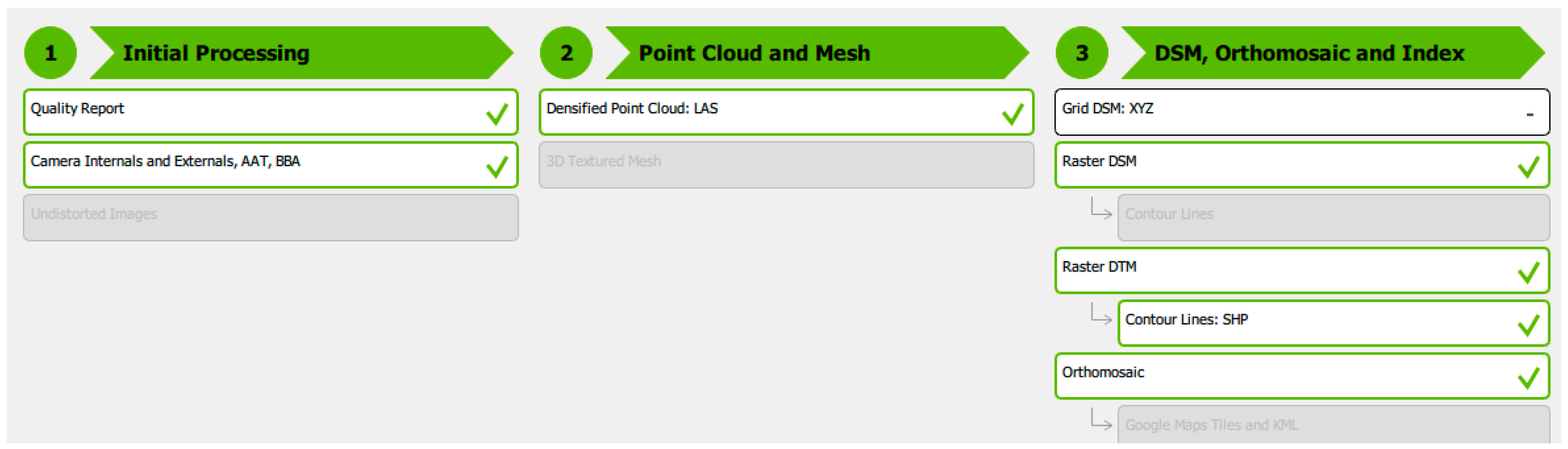 The second and third stages of Point Cloud and Mesh and DSM, Orthomosaic and Index processing, respectively, allowed not only compacting 3D point clouds and generating 3D textured surfaces, but also creating a DEM, orthophoto, reflectance map, and index map. A second report assessing the quality of the work has been received.